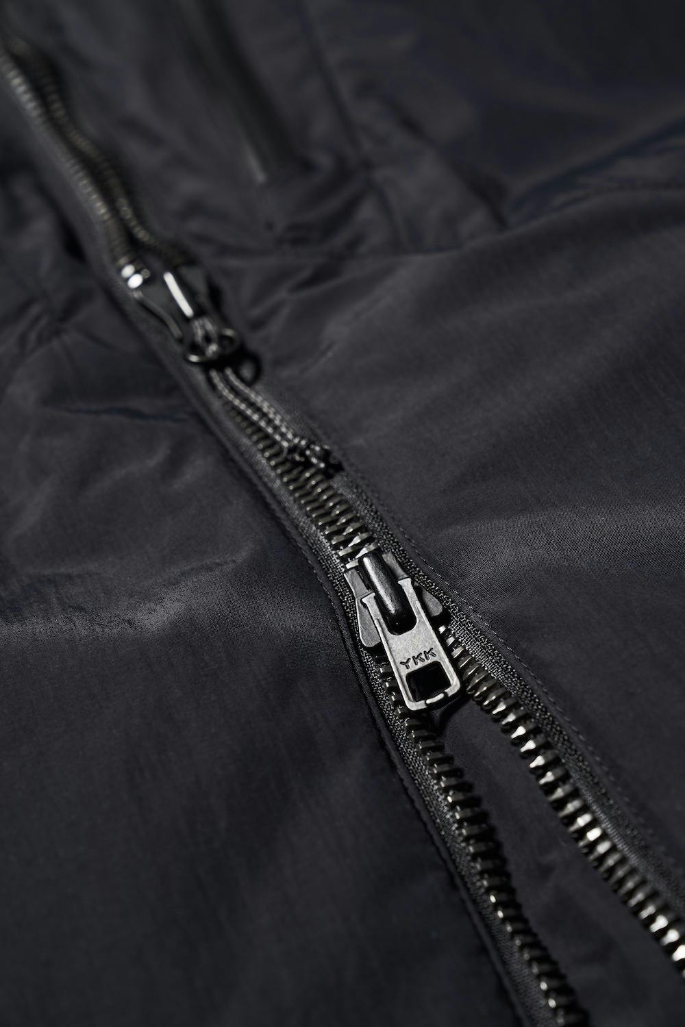 軽いビスロンでありつつ重厚感をもたせたメタルックスファスナー。⾦属のような重厚感をもたせることで安っぽさを払拭、上質を演出しています。もちろんウエア内温度を調整しやすいダブルスライダーです。