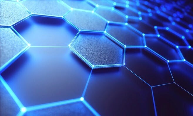 炭素原⼦が六⾓形に結びついてシート状になったものが「グラフェン」です。1nmという極薄シートでダイヤモンドに匹敵する強度をもちながら⾮常に柔軟。しかも熱伝導率の⾼さで知られる銅よりも素早く熱を伝える性質をもつという特徴があります。