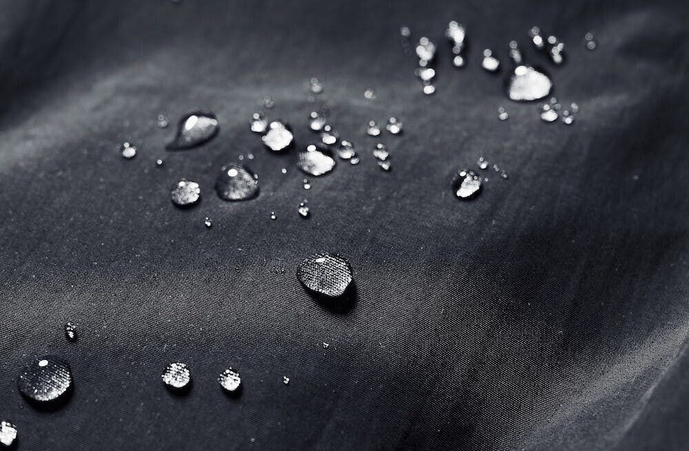 ⽣地表⾯にシリコン樹脂やフッ素樹脂をコーティングするのが撥⽔加⼯ですが、「超耐久撥⽔エピック」は繊維そのものを防⽔ポリマーで包み込み、さらに繊維の隙間を防⽔ポリマーで埋めるという世界で唯⼀の3次元バリア構造をもちます。繊維そのものに撥⽔性をもたせているため⽣地が⽔を吸って重くなることはなく、⻑く⾼い撥⽔性をキープ。