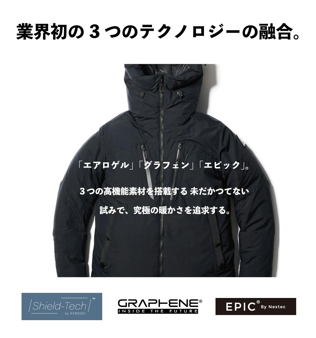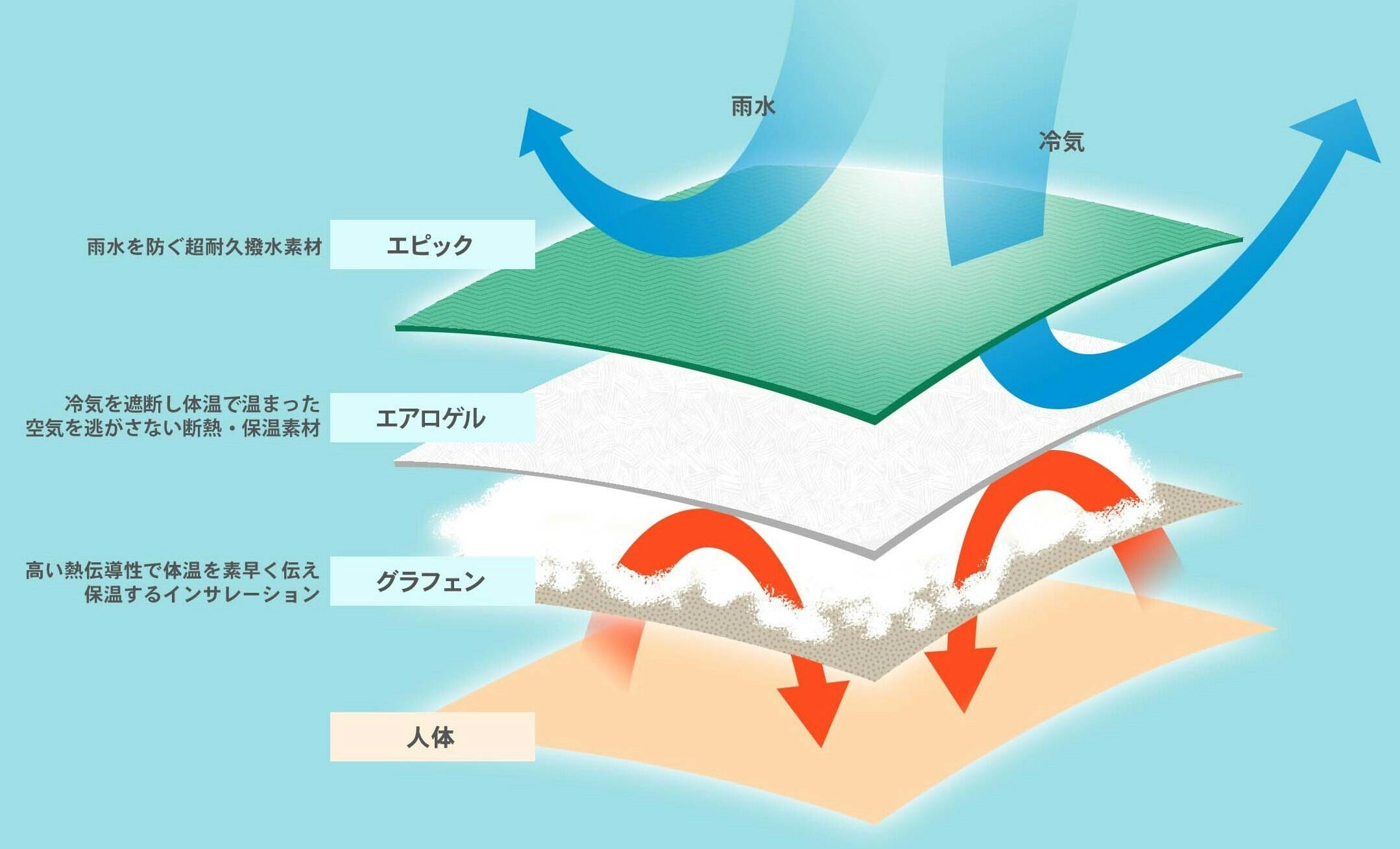 「グラフェンダウンインサレーション」が段違いの速さで体熱をあたたかい空気の塊に変え、最先端の軽量断熱素材「シールドテック by エアロゲル」で冷たい空気と⾵を遮断する⼀⽅であたたかい空気をキープ。このハイテク素材の組み合わせはアウトドアブランド初の試み。そして、この効果を⻑時間維持させるために表⾯を「超耐久撥⽔エピック」でバリアします。