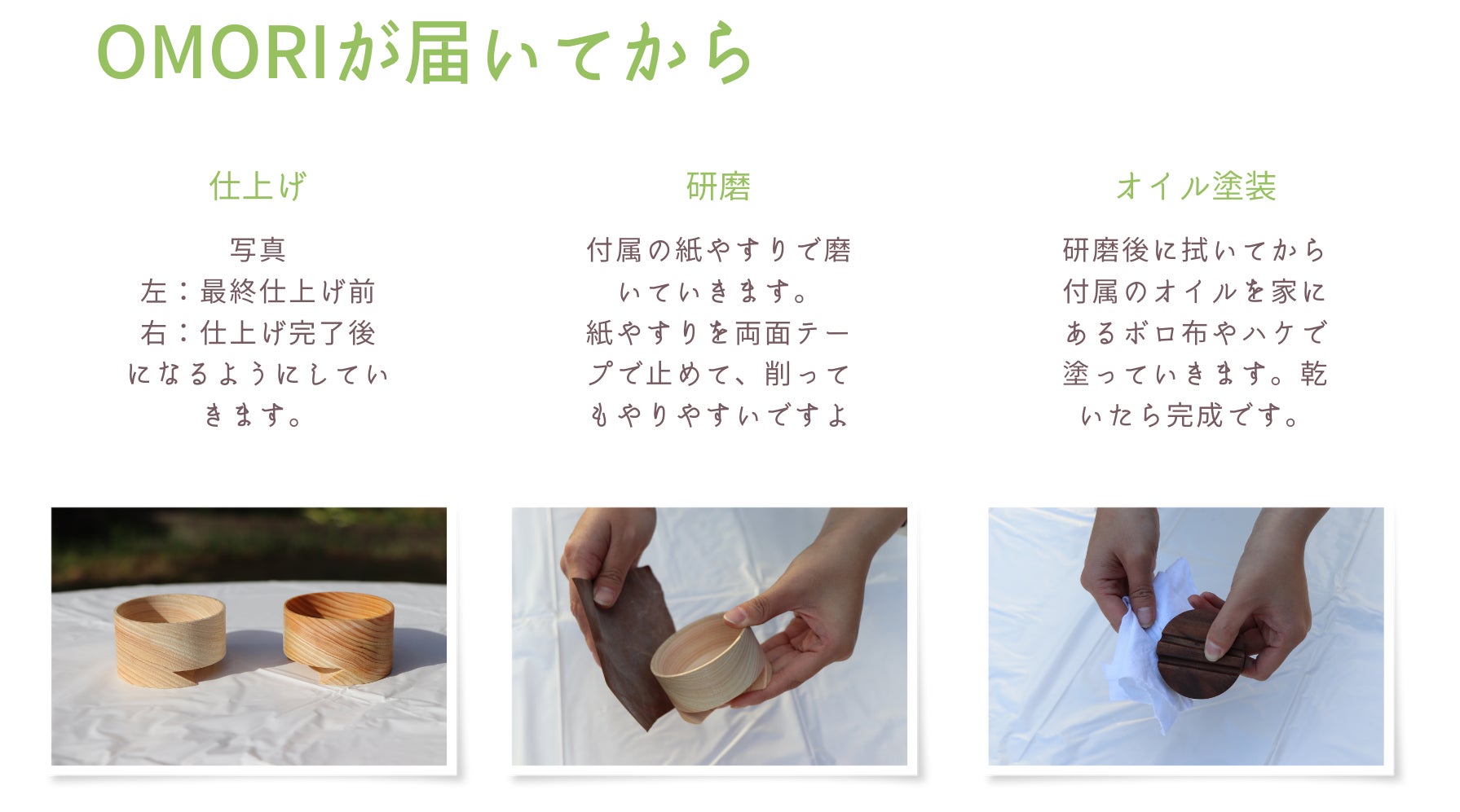〇木の香りや温かみを感じながら、仕上げをして、自分だけの『OMORI』に