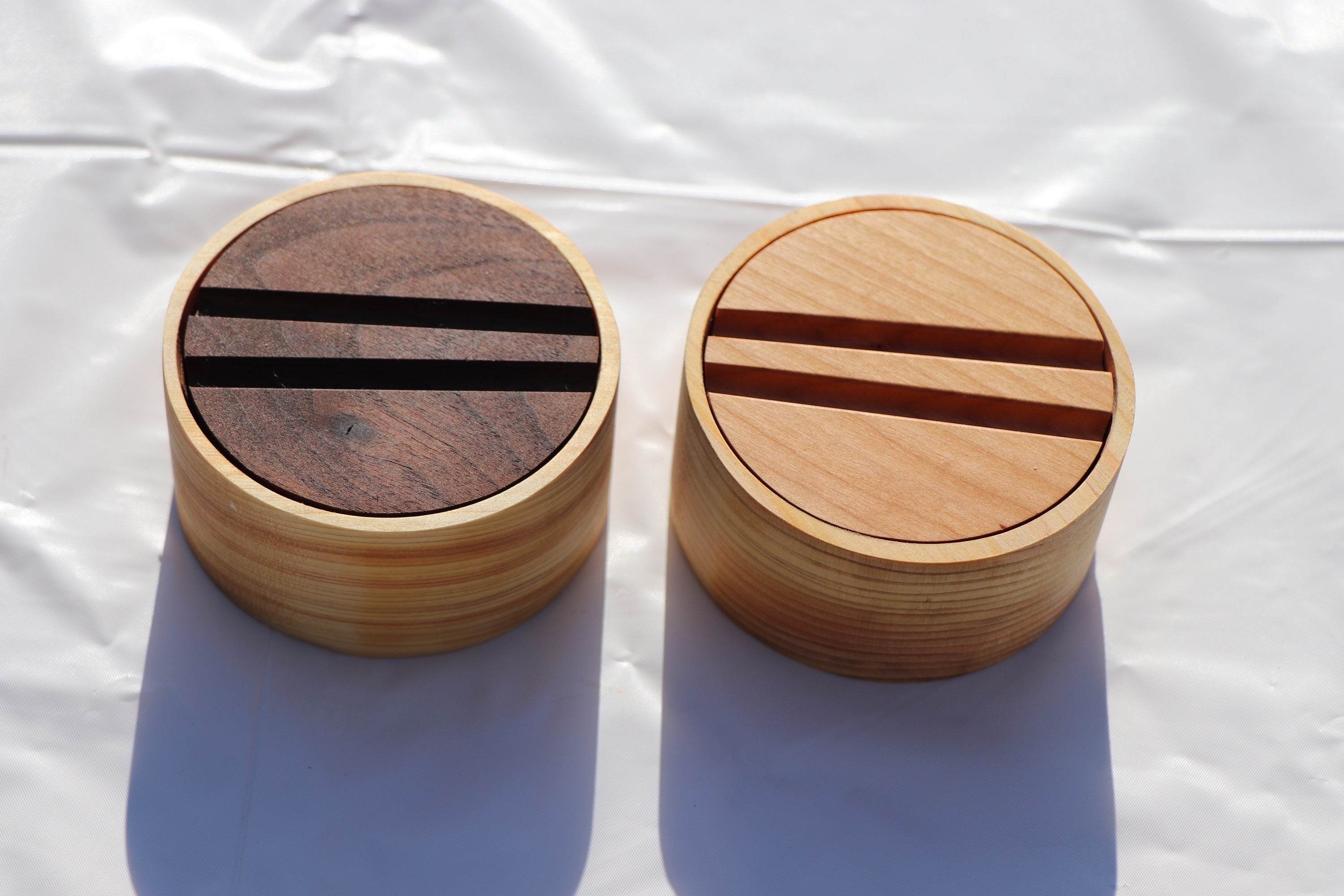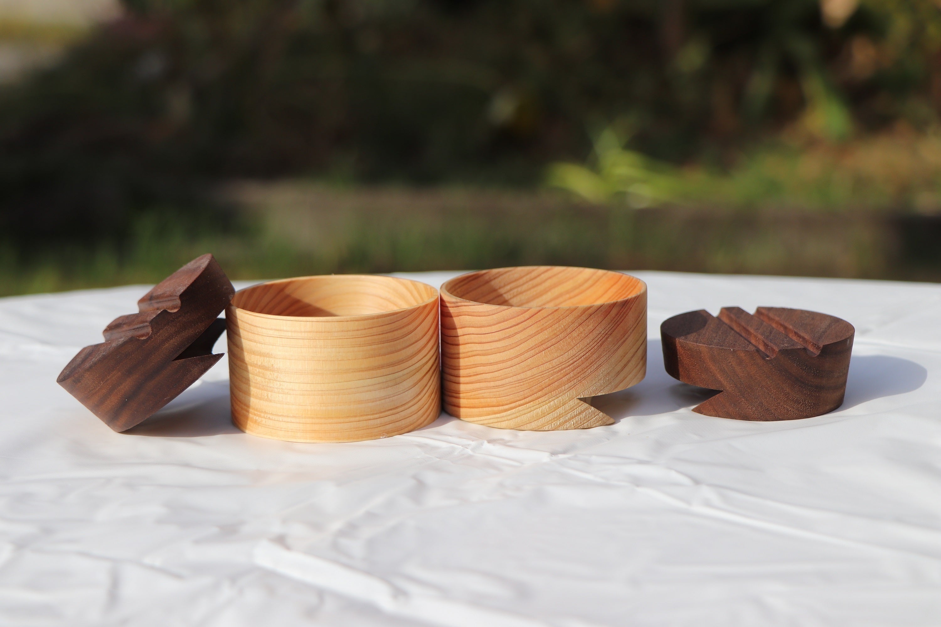 ヒノキ、ウォールナット、チェリーの表面を紙やすりで削り、オイルで塗装して完成です。