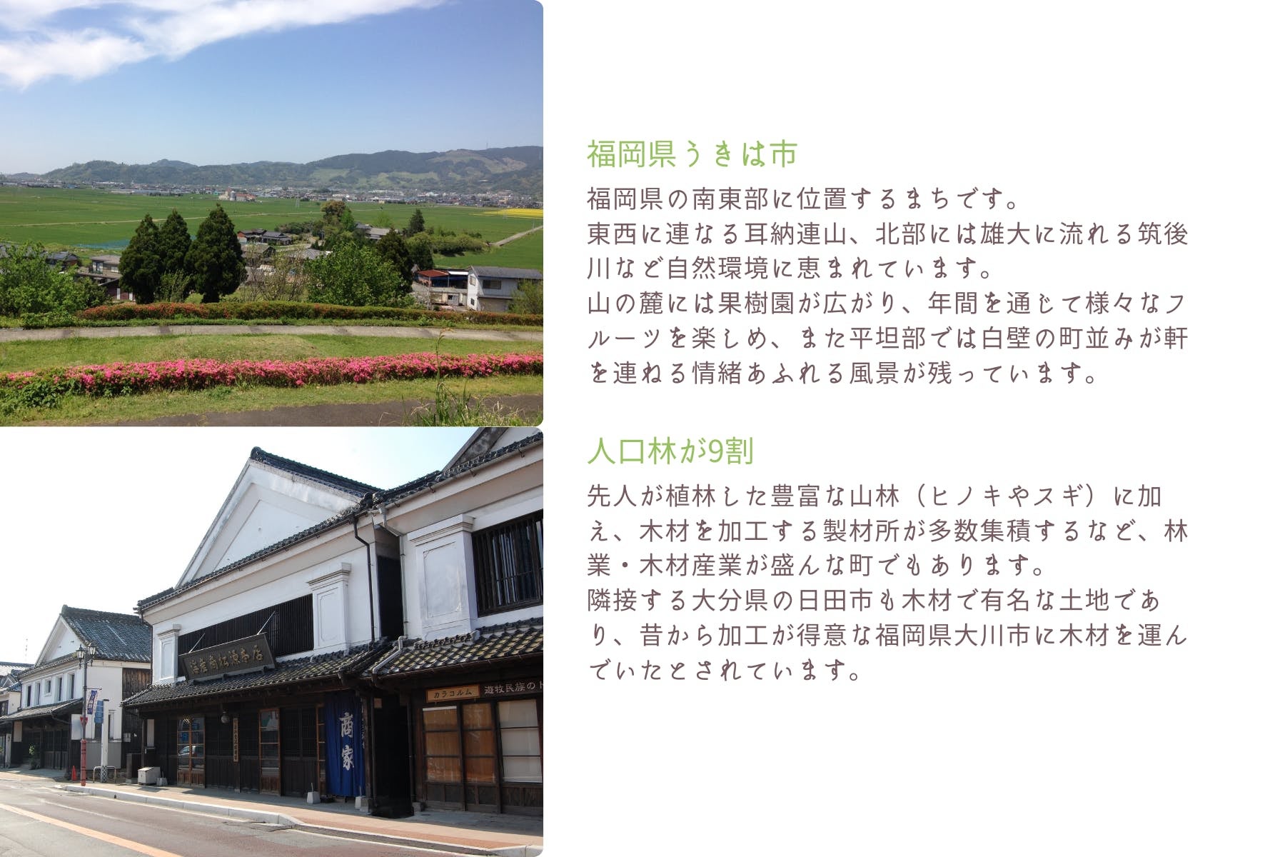 これらは先人が、子孫が豊かになるよう願い植えてきたもの。うきは市にも、そうしたスギ・ヒノキ山の人工林が90%、そのうち57%は、伐採に適した時期に来ている木になります。