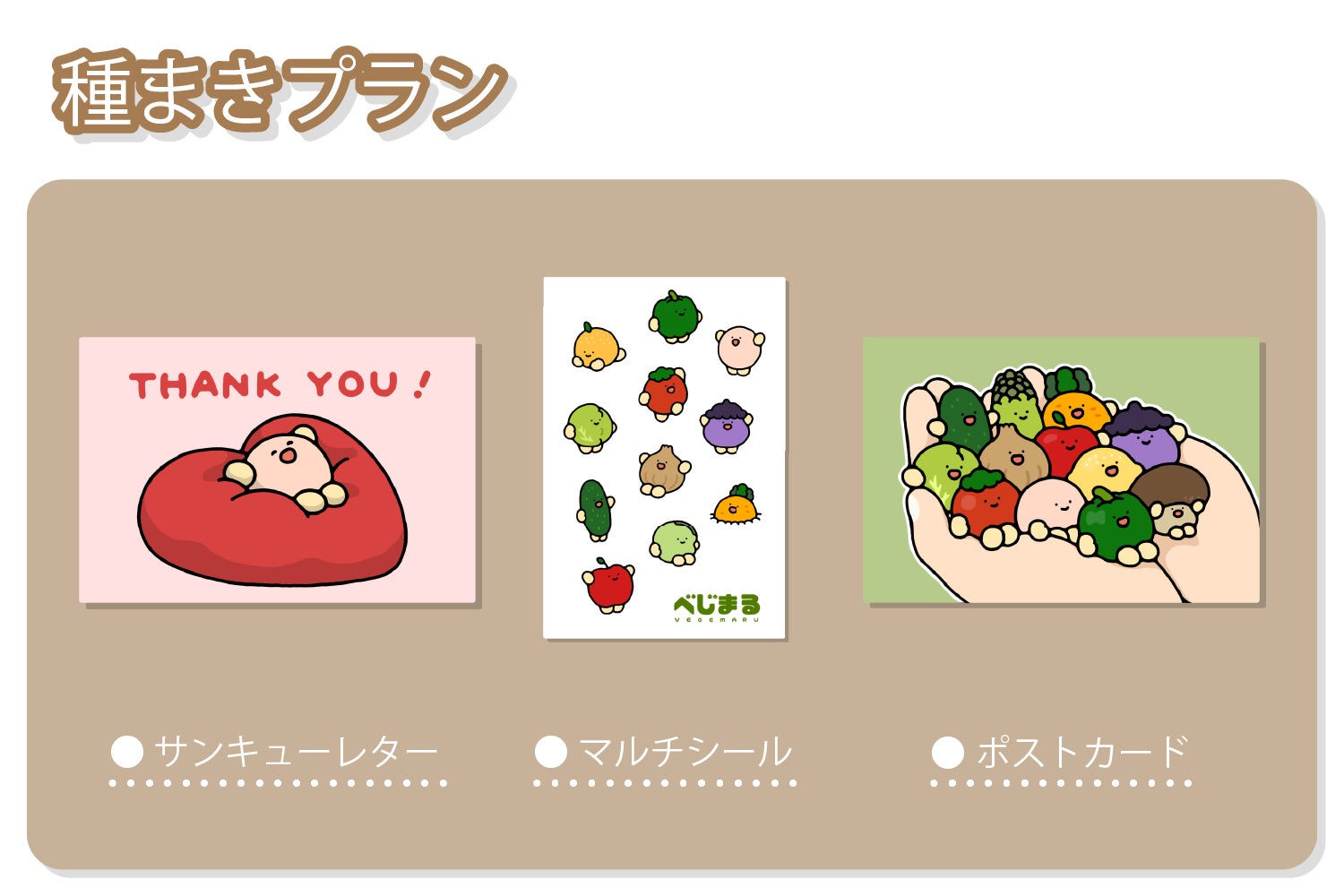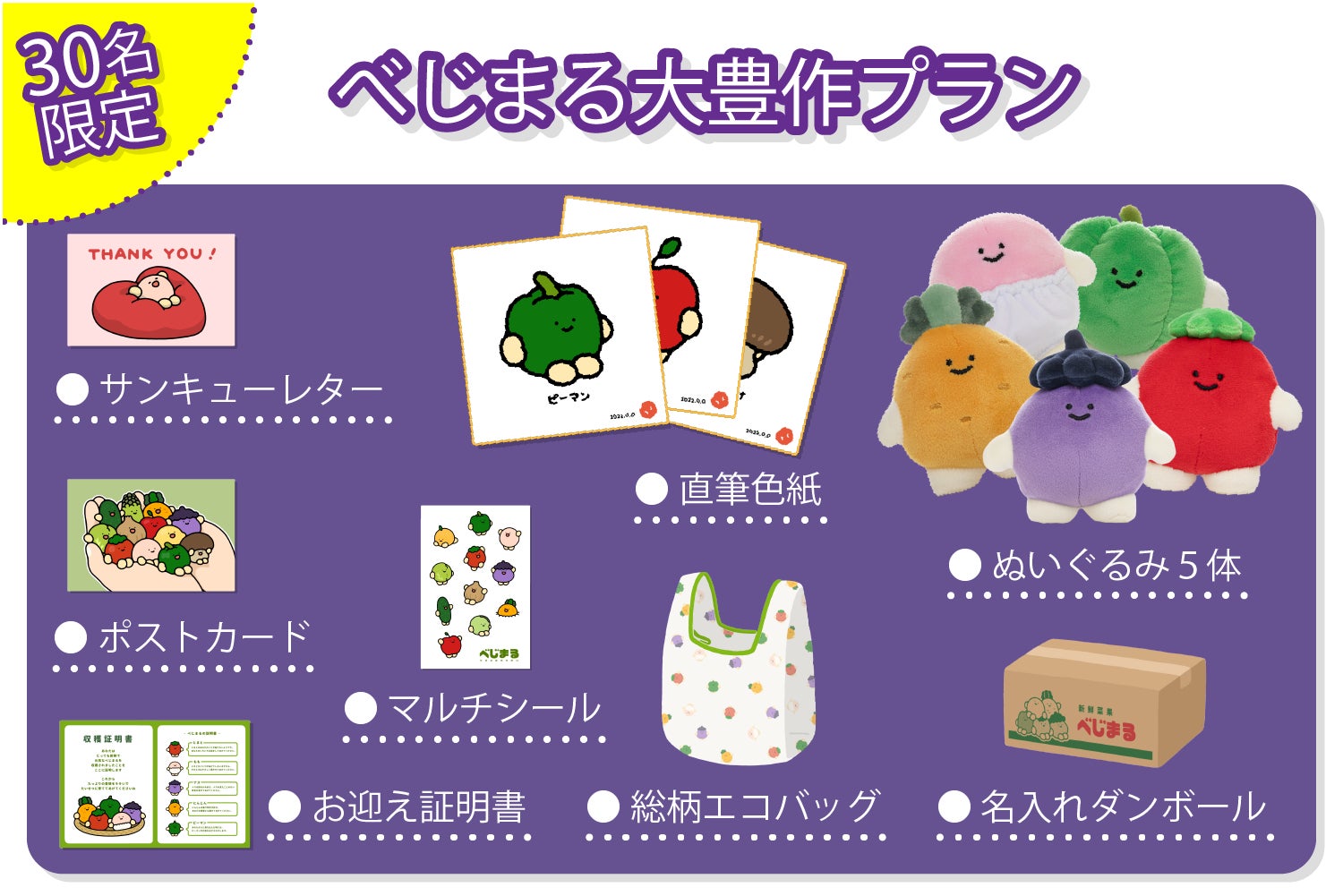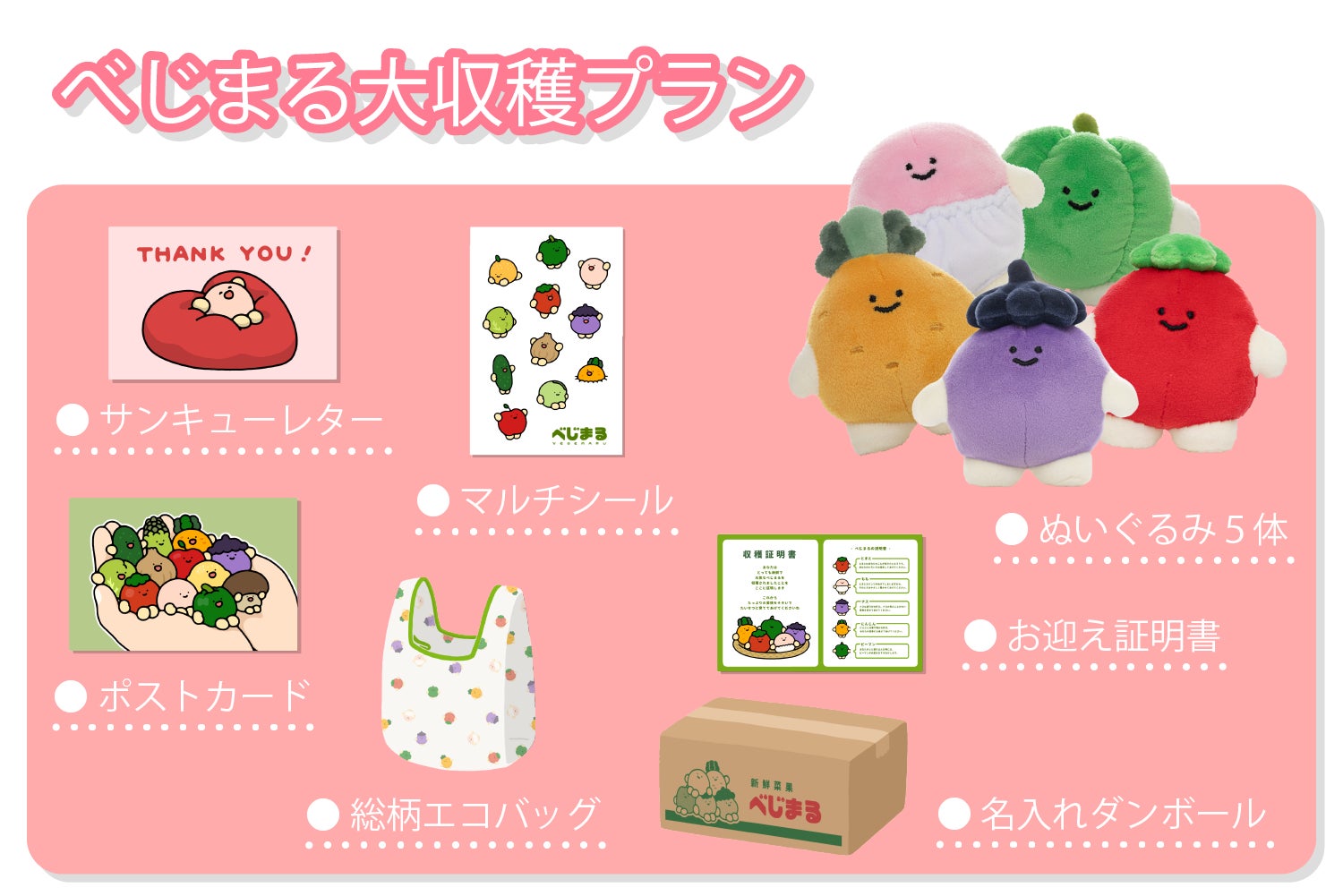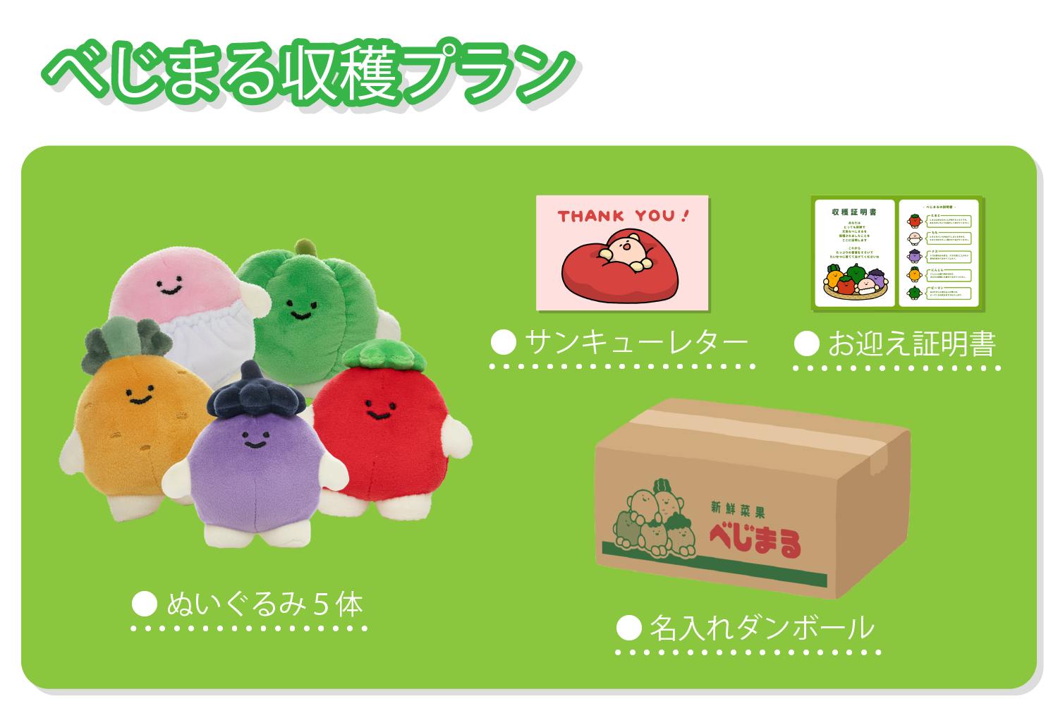 ぬいぐるみが欲しい方はまずこちらをチェック!べじまるぬいぐるみ5体を、特製段ボールでお届けします。
