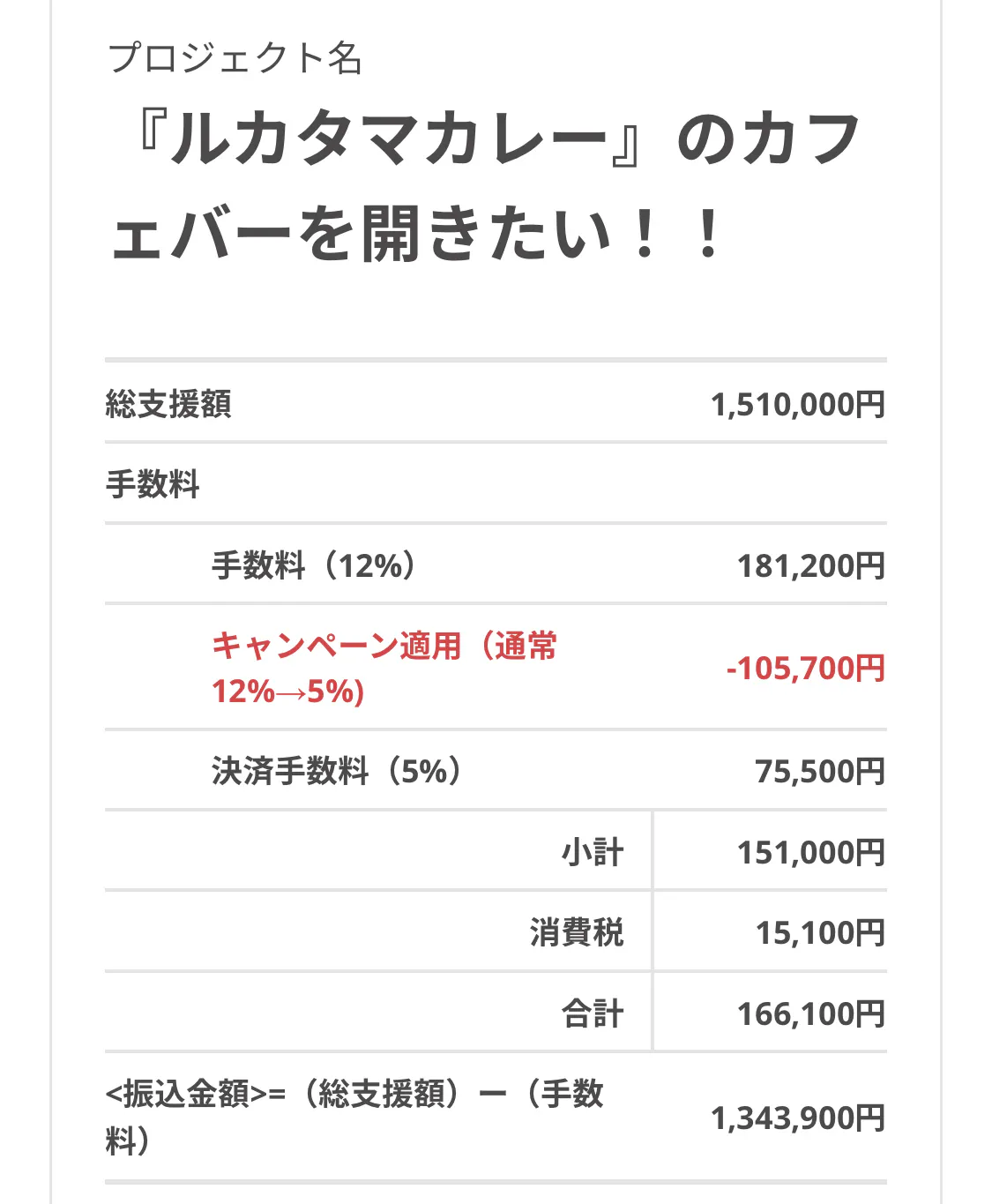151万円集まった資金の内、画像にある通り手数料と決済手数料が引かれ、今回私の手元に届く金額は1,343,900円となります。こちらの金額は、当初の予定通り全て内装工事の費用に充てさせていただきます!