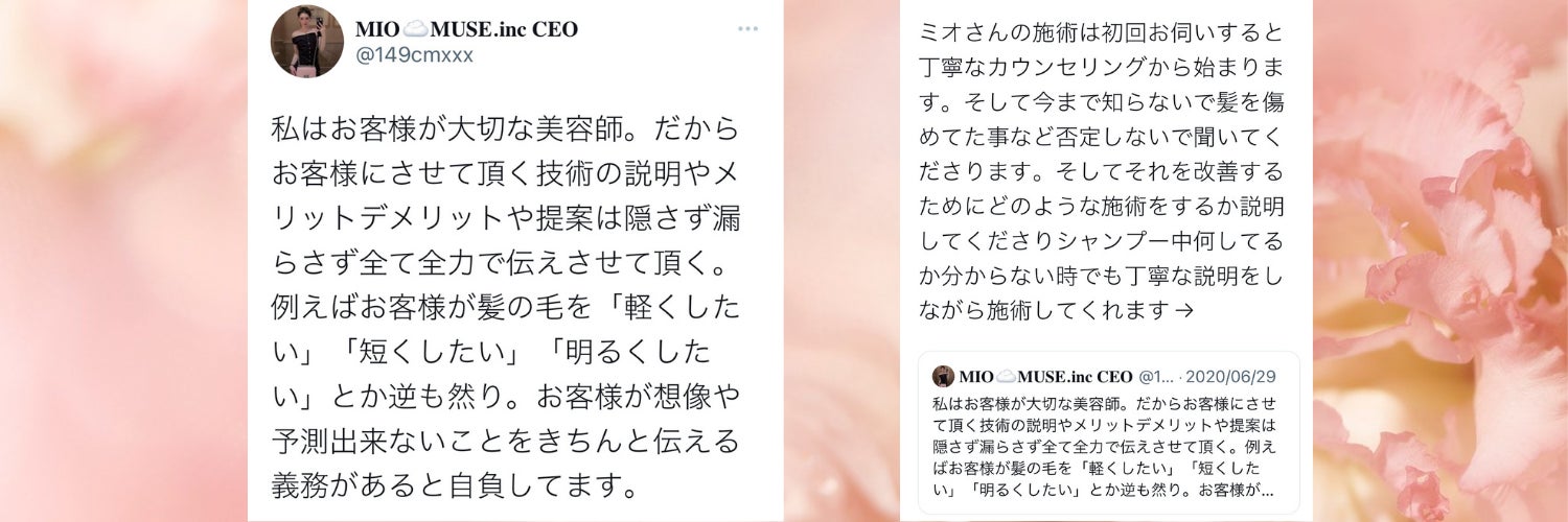 顧客0での入社後、ミオさんのお客様に対する情熱や活動が Twitterで話題となり、たくさんのファンとお客様に支持され、伝説的な功績を積み上京して4年で、美容師としても女性としてもさらなる成長とお客様へ提供したい新しいカタチを生み出すために独立。