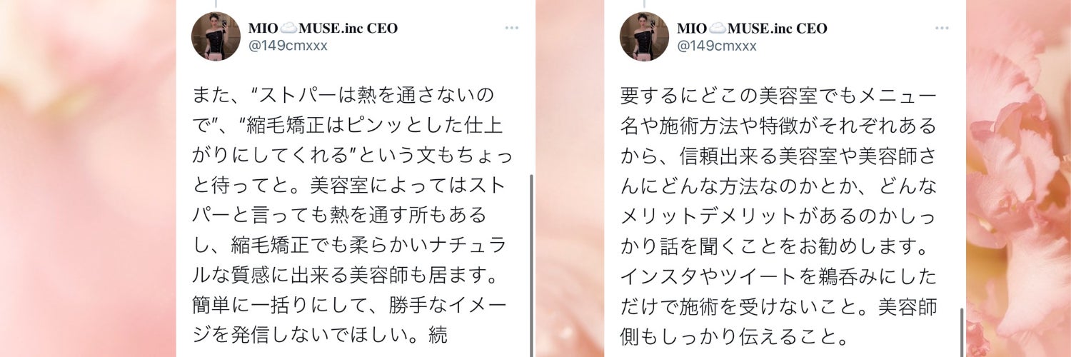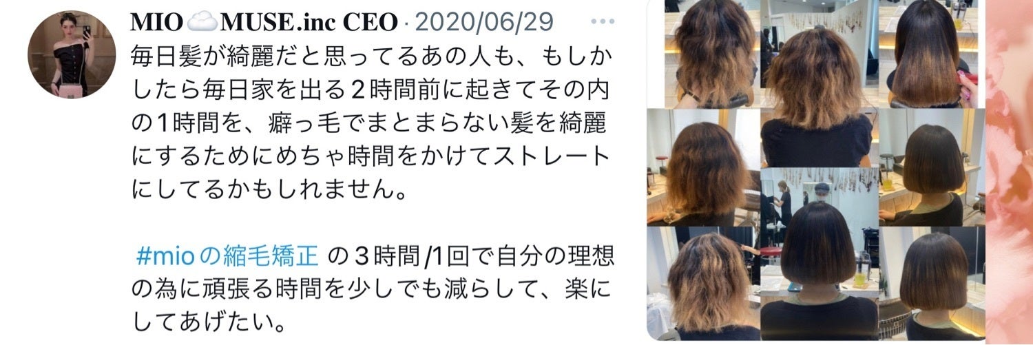 カワイミオさんといえば、7年地元で美容師を経て25歳で上京してすぐ、Twitterを始めとしたSNSが話題となり、今やフォロワー1万人を超えた人気の女性美容師さん。いえ、フォロワーの数がポイントなのではなく、お客様やフォロワーさんのミオさんへの信用度合いに驚きます。(Twitter #mioの縮毛矯正 #mioの髪質改善トリートメント #mioの口コミ 参照。)