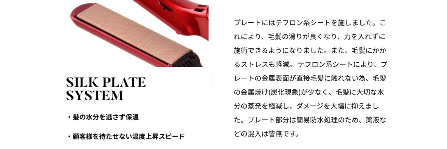 ──── ヘアアイロンの髪を挟む部分に特殊加工の高級シルクプレートを使用することで、髪が高温状態でも極限まで水分蒸発を抑えることで髪の中の水分が一気に蒸発せず、タンパク変性により髪が硬くならないため、パサつかずに柔らかいぷるぷるの質感のアイロンヘアーが実現でき、さらに摩擦が最小限に抑えられる効果で枝毛や切れ毛を最大限に予防が可能・・・まさに「ヘアアイロンをしてるのに髪が傷んだ感覚にならない」「アイロンする前より、アイロンした方が髪がぷるぷるに柔らかくて綺麗になる」ヘアアイロン。