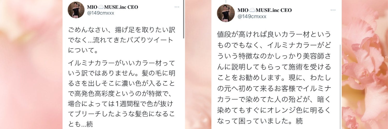 カワイミオさんといえば、7年地元で美容師を経て25歳で上京してすぐ、Twitterを始めとしたSNSが話題となり、今やフォロワー1万人を超えた人気の女性美容師さん。いえ、フォロワーの数がポイントなのではなく、お客様やフォロワーさんのミオさんへの信用度合いに驚きます。(Twitter #mioの縮毛矯正 #mioの髪質改善トリートメント #mioの口コミ 参照。)