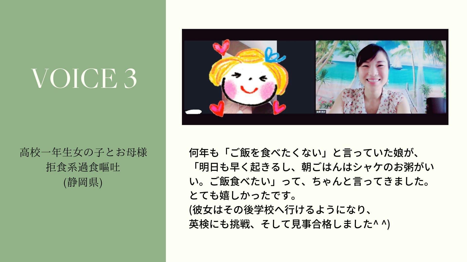 ※受講される方が摂食障害を手放して、最高の人生を手に入れられるよう全力を尽くしますが、プログラムの効果やプログラム後の変化には個人差がございますことを予めご了承くださいませ。(プログラムの内容を忠実に実践されたクライアント様は摂食障害手放しに100%成功しています。2021年11月12日現在)