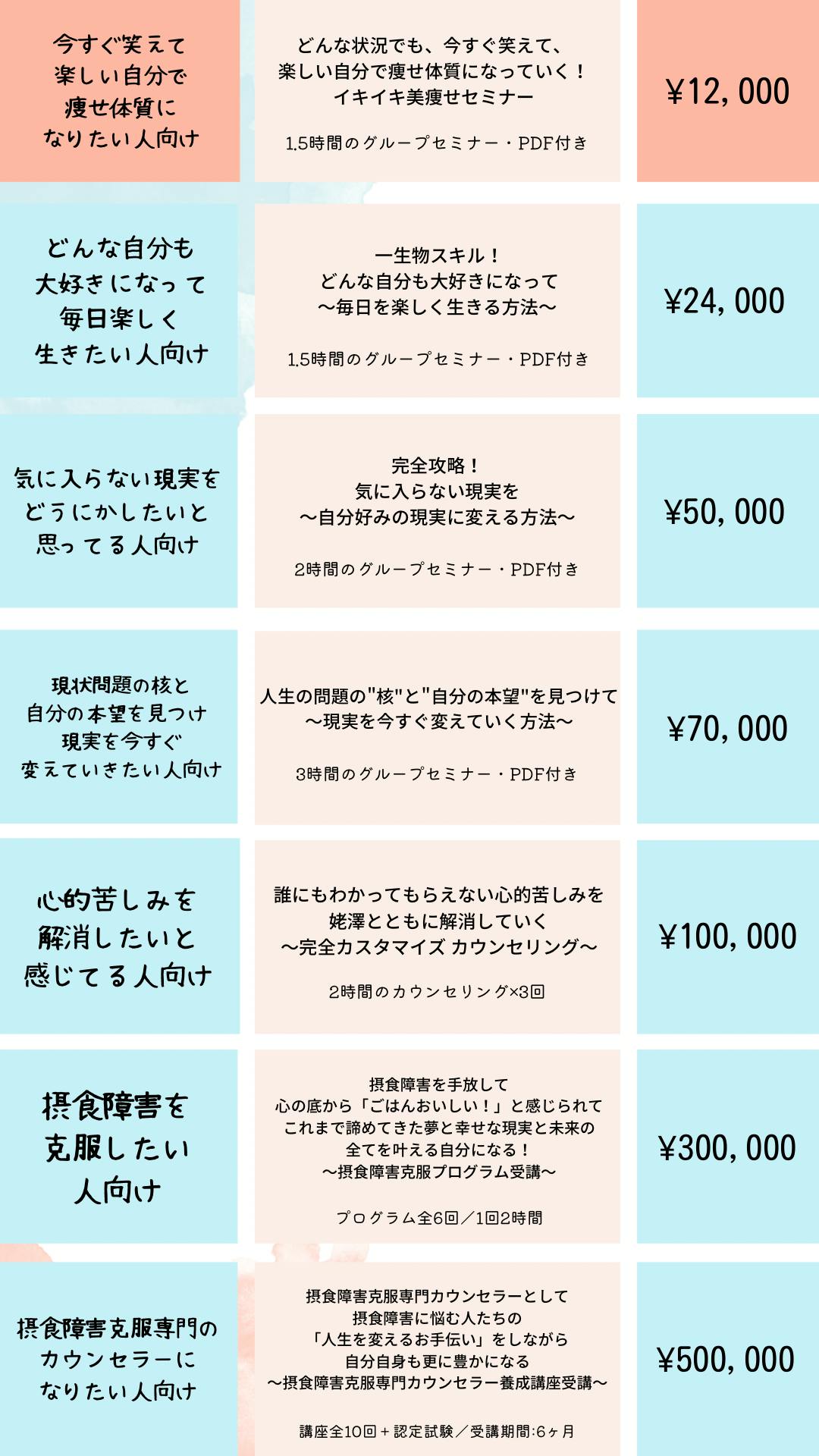 摂食障害を克服するために学んだことは、カウンセラー養成講座・全米認定NLPプラクティショナー・脳心理学・発達心理学・潜在意識・パートナーシップ・心身を整える食事法マクロビオテックなど様々ですが、このどれもがその一つずつでは克服には繋がなかったことから、これら全ての中から「摂食障害克服に必要な要素だけ」を取り出し、最も効果的に摂食障害克服に結びつけるための順序を立ててプログラム化し、摂食障害克服プログラムを開発しました。