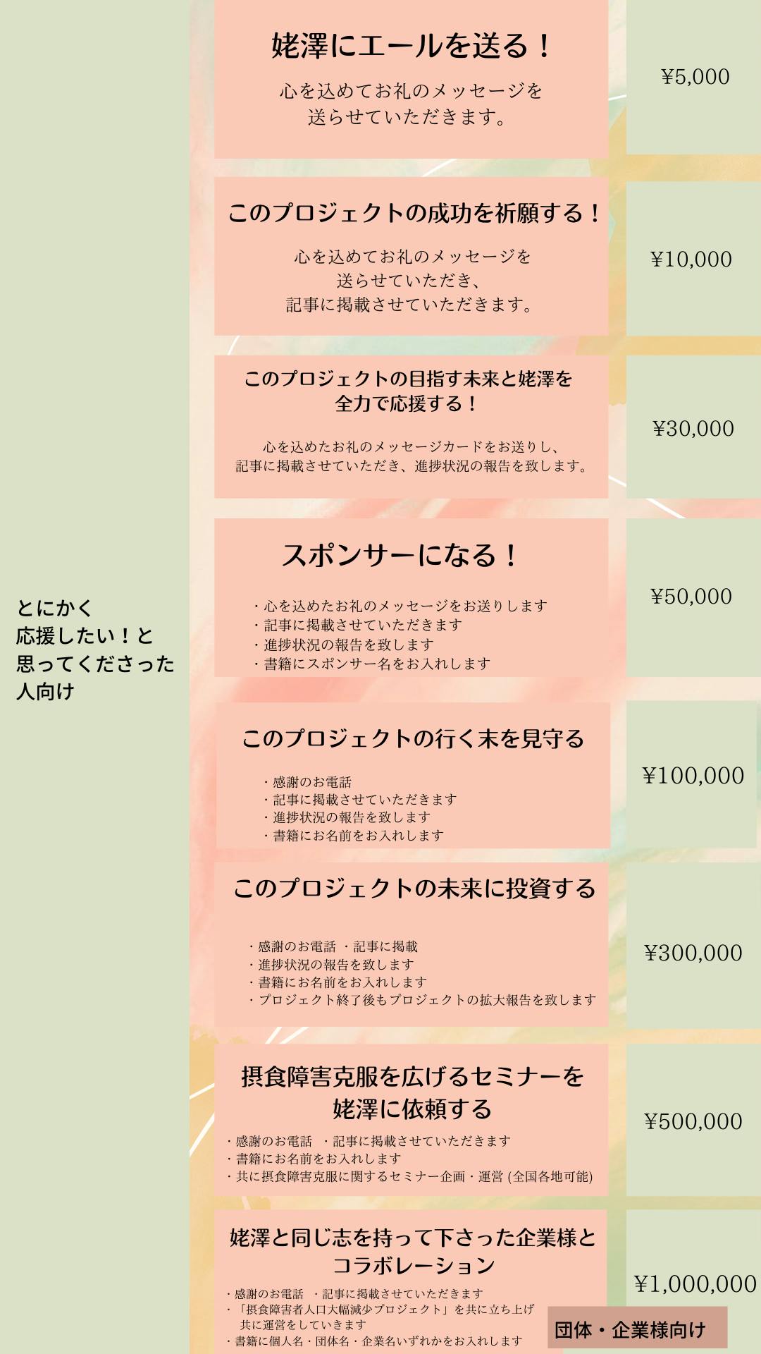 わたしの持ち味である、カウンセリング・コーチング技術を活かしたリターンプランになっています。人生を更に楽しく幸せにするためのセミナー各種・カスタマイズカウンセリング・摂食障害克服プログラム受講権利・摂食障害克服専門カウンセラー養成講座受講権利などをご用意いたしました。セミナー・プログラム・養成講座の受講権利は、支援者様ご本人様の他、支援者様のご家族様、ご友人知人様に譲渡することが可能です。必要な方に届きますように。