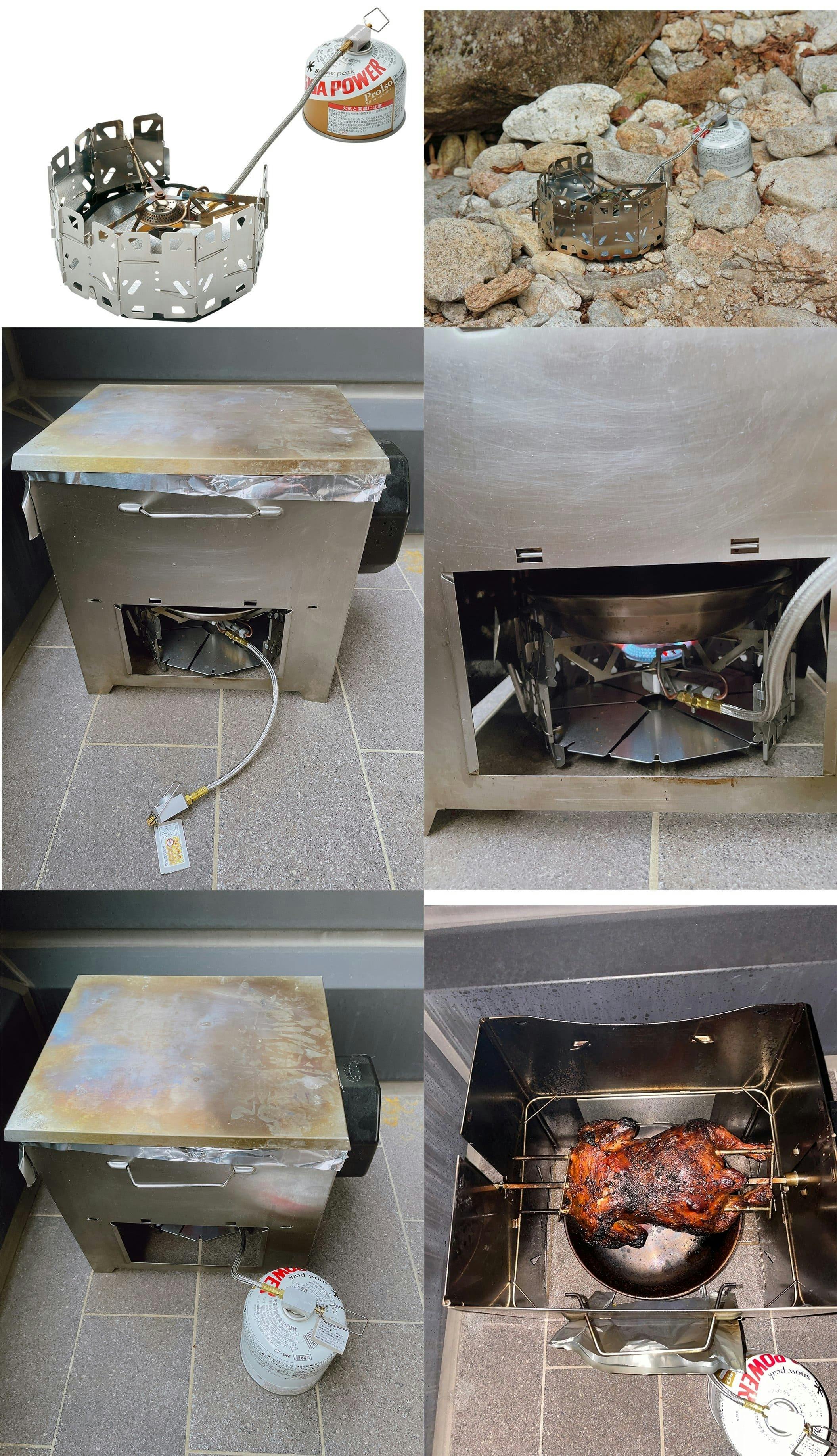 1,画像のようにシングルバーナーを折り畳み式グリルの下に設置します