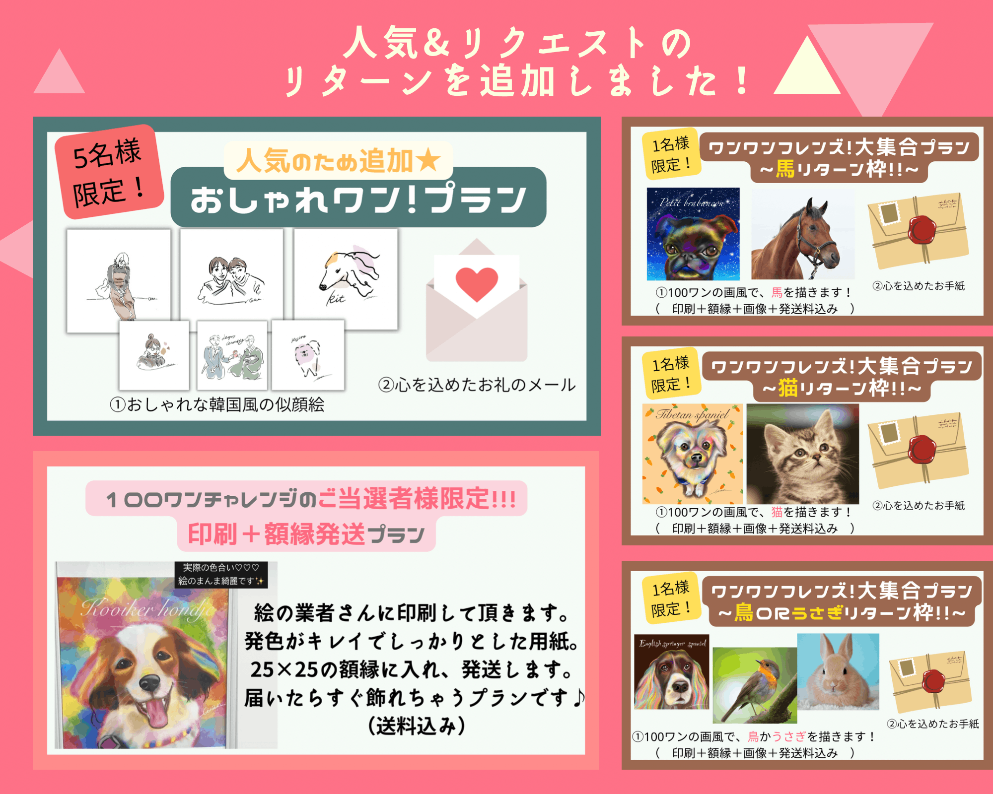 ❸ ワンワンフレンズ大集合プラン【馬】【ネコ】【うさぎ】の似顔絵プラン【各1名様限定】