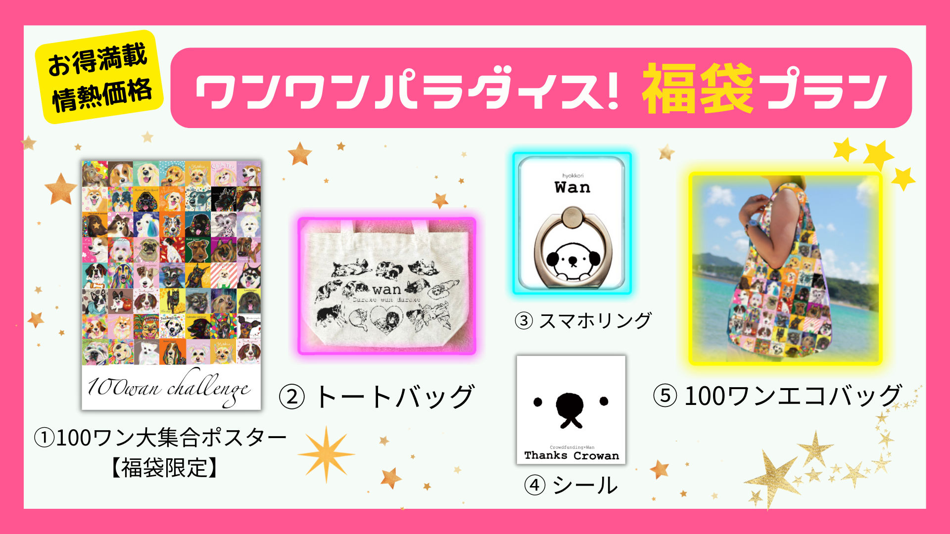 10000円▶︎ 100ワンポスター+トートバッグ+スマホリング+シール+エコバッグ