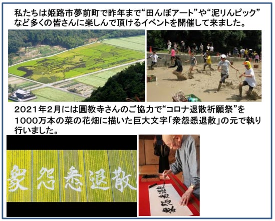 新型コロナウイルスの感染拡大で色んなイベントが中止になる中、皆さまの気持ちを癒せることが出来ないだろうか?スタッフと考え夢ランタンイベントならコロナ禍でも実施できると判断し2021年8月から多くの方に参加いただき開催してきました。2月の菜の花畑での夢ランタン祭りは今年度を締め括るイベントです。花火を交えたコロナ退散のファイナルにしたいと思います。