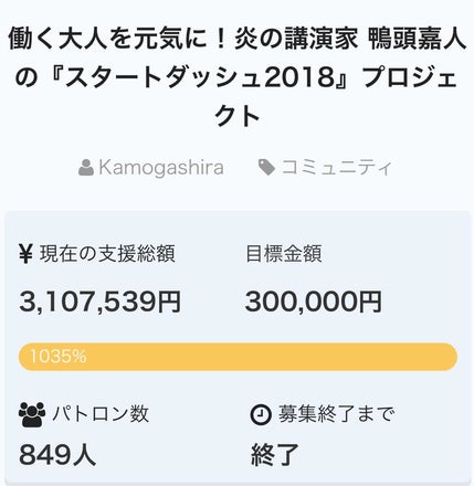 2017/12/21 10:38クラウドファンディング怒涛の快進撃で最終結果は支援者数 849人‼️ 最高最上の結果でした‼️ これも皆んな応援してくださった方々と共犯者として名乗りを上げてくれてボランティアスタッフの強力なリーダーシップのおかげさまです‼️ 本当に本当にありがとうございました♡ 炎の講演家 鴨頭嘉人史上最高のセミナーとして支援者全ての方へのご恩返しをさせていただきます‼️みんな〜大好きで〜す❤️❤️❤️❤️❤️ もっと見る【追加募集!】大阪と福岡のボラスタ