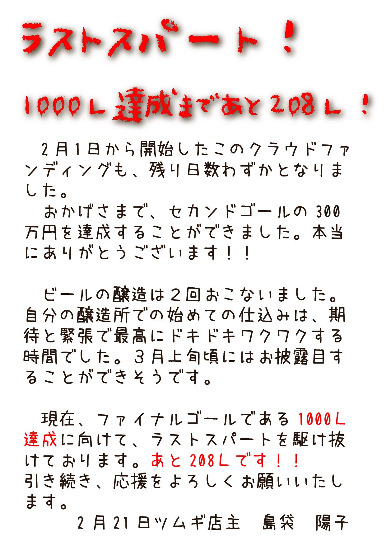 2023/05/30 10:40クラウドファンディングリターンの瓶ビールについてご報告です。ようやく瓶詰可能な品質のビールを作れるようになりました。これは私の個人的な考えですが、ビールを樽から生で提供するのと、瓶に詰めてお届けするのでは求められる品質が違うと考えています。お店で直接提供する場合、工場とお店は隣接しているので完成したビールをほぼ動かさず、さらにビールの状態を常にチェックできるため自信を持ってご提供できます。しかし、瓶ビールの場合は、冷蔵配送とはいえ飛行機や車に乗って運ばれていき、お客様が栓を開けてグラスに注ぐ瞬間を確認することができません。私自身、通販で購入したクラフトビールの品質に疑問を持った経験があります。おそらく瓶詰めの段階では大丈夫だったのが、配送中に品質が落ちてしまったと考えられます。それはとても怖いです。そこで、配送に耐えうる品質のビールが作れるようになってから瓶ビールを作ろうと、あらかじめリターンの配送を6月中に設定させていただいておりました。6月末までにはお手元に届くようにいたしますので、もう少々お待ちくださいませ。また、新年度になり転居等で配送先が変わられた方がいらっしゃいましたら、配送先はこちらから変更できますので、ご入力お願い致します。https://help.camp-fire.jp/hc/ja/articles/6877786247833-%E6%94%AF%E6%8F%B4%E3%81%97%E3%81%9F%E3%83%AA%E3%82%BF%E3%83%BC%E3%83%B3%E3%81%AE%E3%81%8A%E5%B1%8A%E3%81%91%E5%85%88%E3%82%92%E5%A4%89%E6%9B%B4%E3%81%97%E3%81%9F%E3%81%84「直接取りに行きます」とおっしゃってくださった方には、個別にご連絡いたします。よろしくお願いいたします。Brewery Tumugi 醸造長 島袋陽子 もっと見る