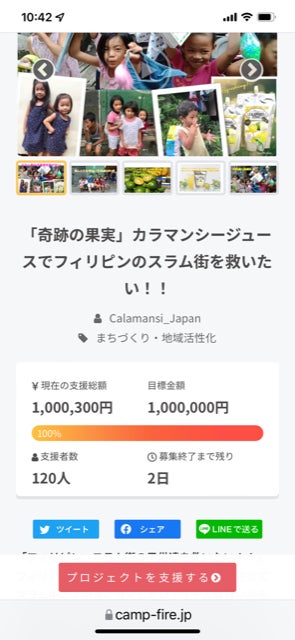 温かい皆さまのご支援により本日無事に目標額を達成しました!残り1日というギリギリの状況でしたが朝の時点で達成が確実になりました。本当に感謝しています。今回で人の温かさを実感しました。これでまたミンダナオ島にカラマンシーを発注できます。現地の方の仕事が増えます。給料が増えます。新たに発注したカラマンシーの売上から現金も送れます。そうすれば現地の方々の生活が少しは楽になるかと思います。子供達も美味しいものを食べれるかもしれません。皆さまの温かいご支援がフィリピンの方達に届く事になりました。感謝しかございません。本当にありがとうございました。皆さまに送るカラマンシーですが、今朝通関業者から連絡があり今月12日に日本に到着しますが食品検査を再度行うため(食品検査の有効期限は1年なので昨年の輸入より1年が経過したため)3月初旬に皆さまに送る事になりそうです。2月中旬とお伝えしていて大変恐縮ですが、3月初旬を目途に準備してまいります。必ず送り届けますので今しばらくお待ち下さい。よろしくお願いいたします。犬童