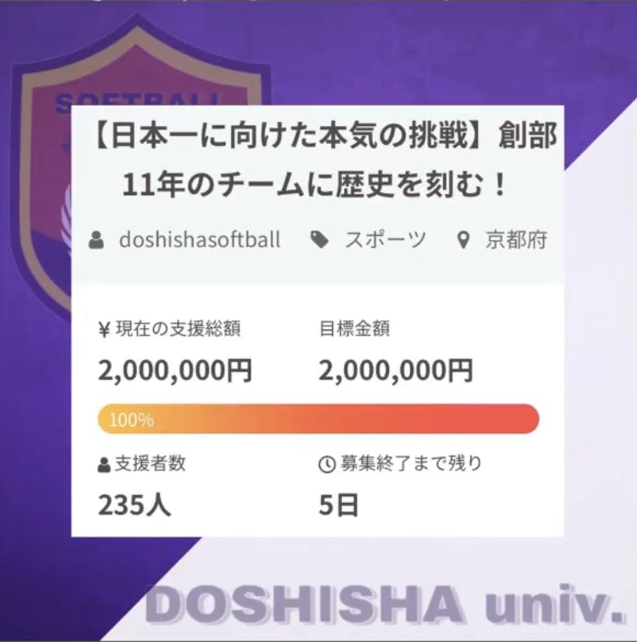 2022/01/26 20:5312月23日にスタートした私達の「日本一」への挑戦への第一歩であるクラウドファンディング。終了日まで残り5日となった本日、目標金額の200万円を達成することができました。ご支援して頂いた皆様、本当にありがとうございます。中々、目標に近づかなく不安になる日もありましたが、無事に目標を達成することができホッとしました。 そして、200万円という目標を達成する大きな後押しとなったのは、京都新聞社様の記事に掲載して頂けたことにもあります。先日、グラウンドまで取材に来て頂き、25日の京都新聞朝刊に私達の想いや活動風景を掲載して頂き、記事をきっかけに多くの方にご支援をして頂きました。京都新聞社様、取材に来て下さった後藤様、本当にありがとうございました。 しかし、クラウドファンディングの期間は残り5日間あります。ネクストチャレンジとして、20万円を目標金額にプラスし、220万円を最終目標とします。最後の最後まで、「日本一」に向かって私達にできることを全力で頑張りたいと思います。 最後に、支援者様一人一人の温かくも熱いメッセージに、部員全員が背中を押してもらい、オミクロン株が猛威を振るい活動が制限されている中でも、毎日の練習に全力で取り組むことができています。支援者の皆様には、これからも同志社大学ソフトボール部を見守って頂けると嬉しいです。 もっと見る