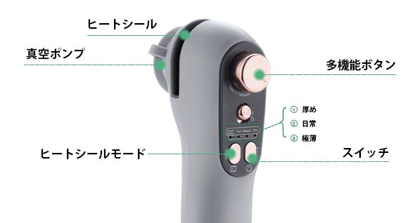 さらに、3段階のヒートシールモードはを搭載。その小さいサイズにもかかわらず、電池容量は1回フル充電で袋約50個分に使用可能。