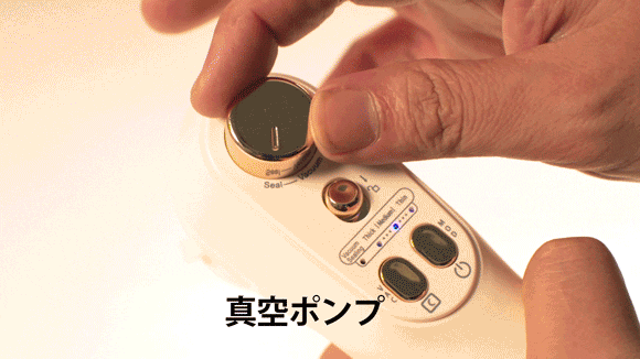 真空口のある袋は、真空口の上に吸引口を置くだけで、ワンタッチで真空吸引ができます。袋は真空になり、口が閉じられます。
