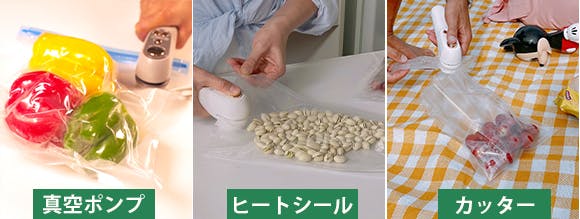 「袋を開け、口を閉じ、空気を抜く」という3つの機能が一つになった、3in1の真空パック機です。