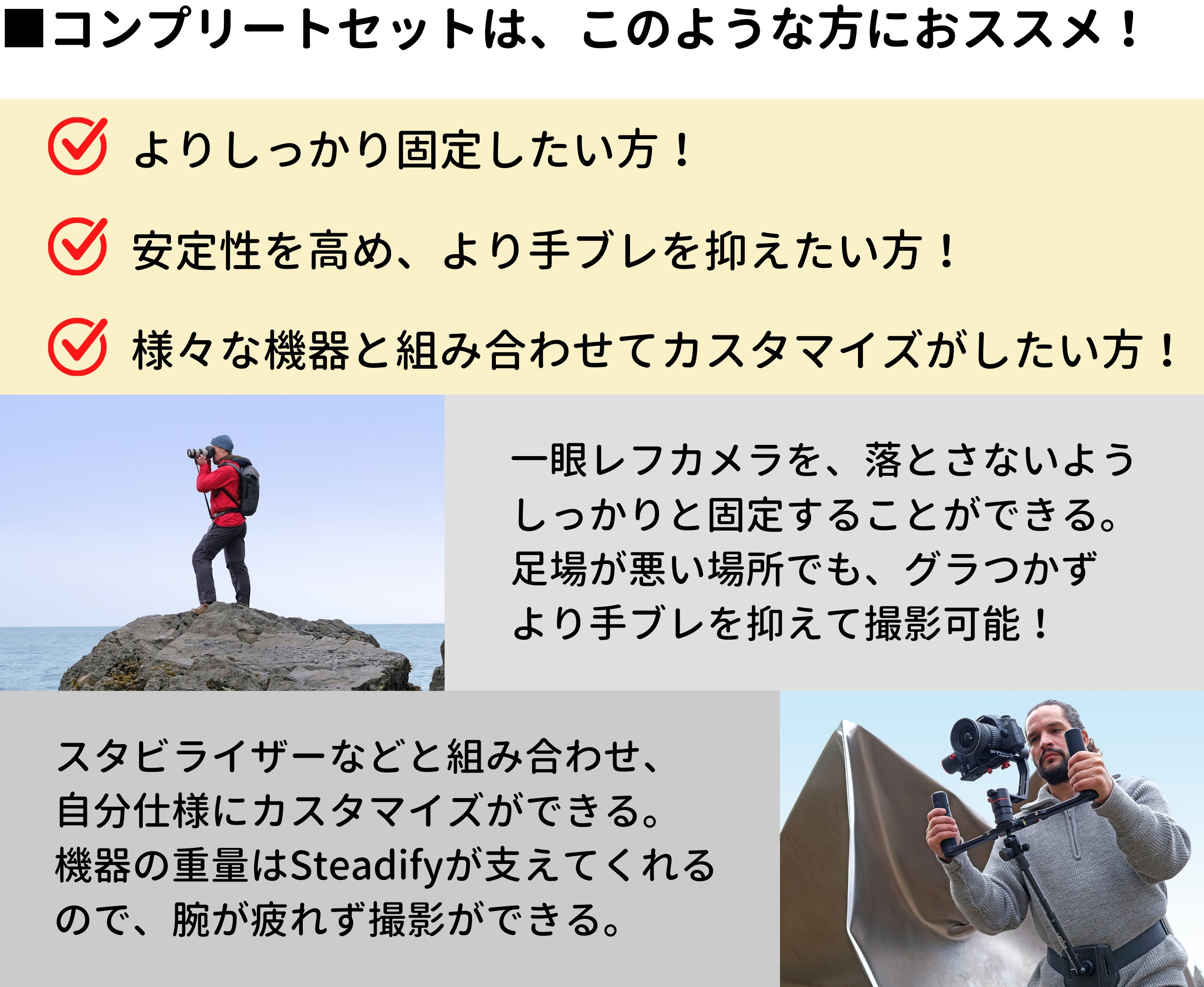 Steadify(ステディファイ)はそういった写真家たちのフラストレーションを取り除き、より快適に撮影ができるよう作られました。