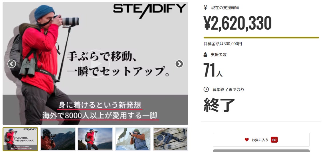 2022/01/16 14:40最後のお知らせです。後9時間でプロジェクトが終了します。→https://camp-fire.jp/projects/view/521417手ぶらで移動ができて、撮りたい時に一瞬でセットアップができる一脚「Steadify」一脚や三脚を持ち歩く必要もないので移動がとにかく楽ですし、ハンディで撮影するよりも手ブレが抑えられるので綺麗な写真が撮りやすくなり、撮影が今よりもっと楽しくなります!そんなSteadifyのプロジェクトも残すところ9時間で終了です。→https://camp-fire.jp/projects/view/521417欲しいけど悩んでいる方もいらっしゃると思いますが、本当に手に入れれるチャンスは残り9時間ですのでまずは購入してみてください。世界で8000人以上に愛用されており、サポート体制は万全ですし、保証もついております。買って後悔するようなことはさせませんので安心してお求めくださいませ。これまでプロジェクトにお付き合いいただき誠にありがとうございました。■Steadifyを手に入れるチャンスは残り9時間で終了■→https://camp-fire.jp/projects/view/521417 もっと見る