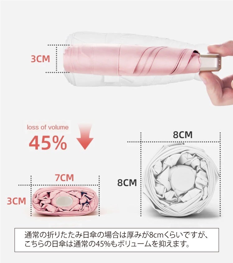 折りたたんでいる時は縦:約18cm、横幅:約7cm、厚み:約3cmと、通常の折りたたみ傘の45%もボリュームダウン!