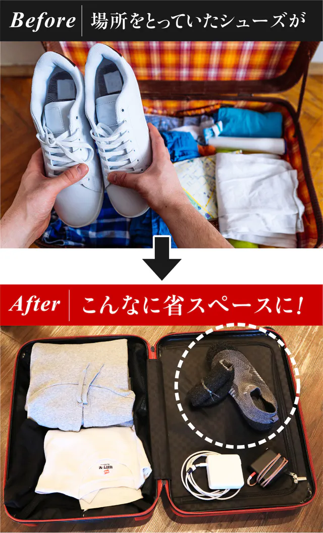 小さく折り畳むことができるから、旅行やアウトドアにかばんに入れて持っていったり、会社帰りのジムのトレーニングシューズとしてもおすすめです。