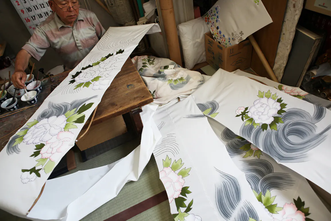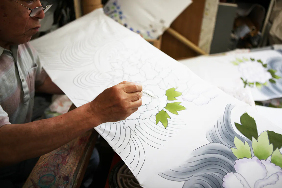 友禅染め技法の手描きとして知られる、友禅と引き染めを駆使してそれぞれ一人二役・三役というかたちで、全員が携わり一人の職人が二つ三つのクオリティの高い技術を持って進めております。