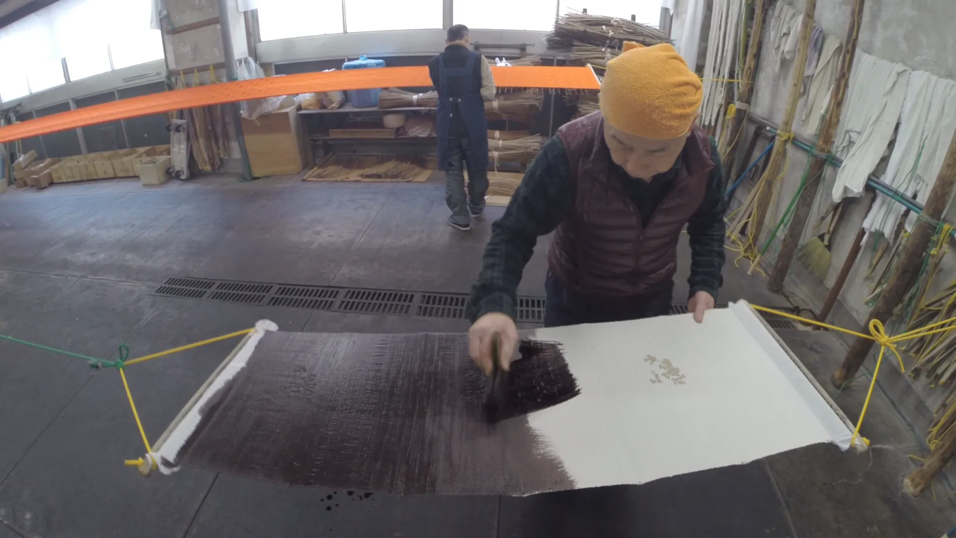 布の模様以外の地の部分を染料を含ませた刷毛で染めていきます。