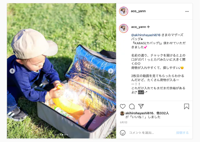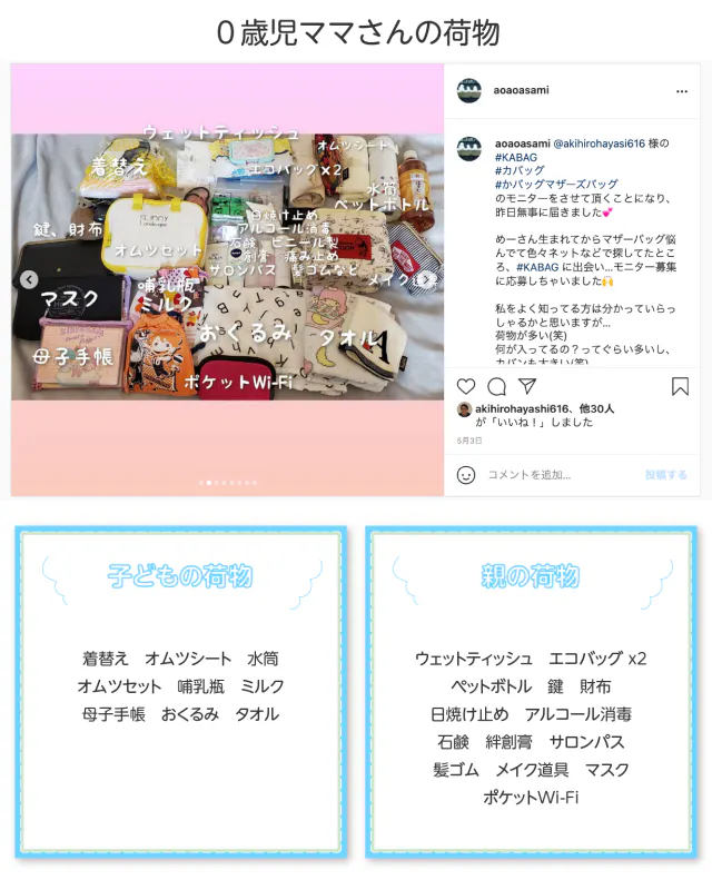 ※ 実際の使用例は、KABAGアンバサダーの皆様にご協力いただいたおかげで実現しました。「ママの声」も合わせてご覧ください。
