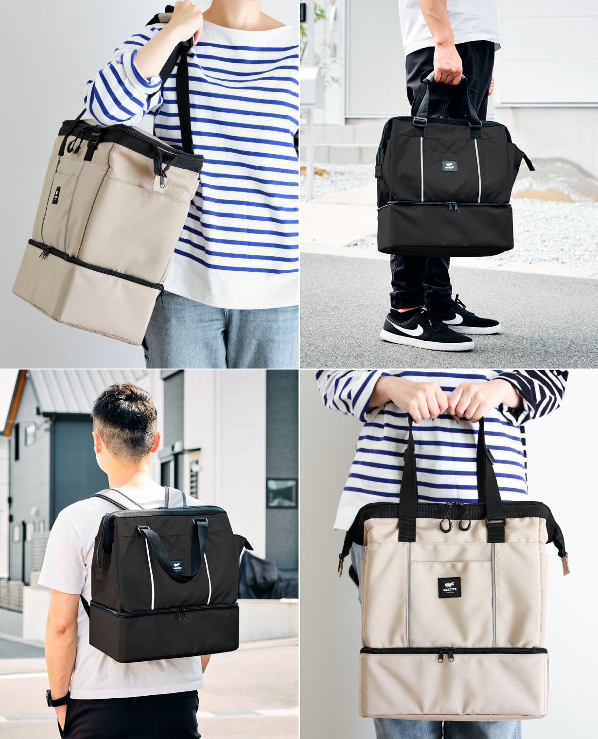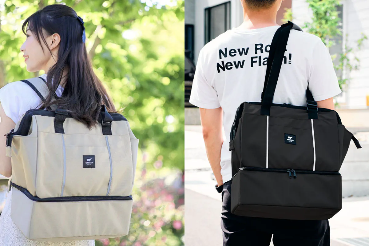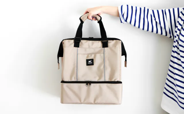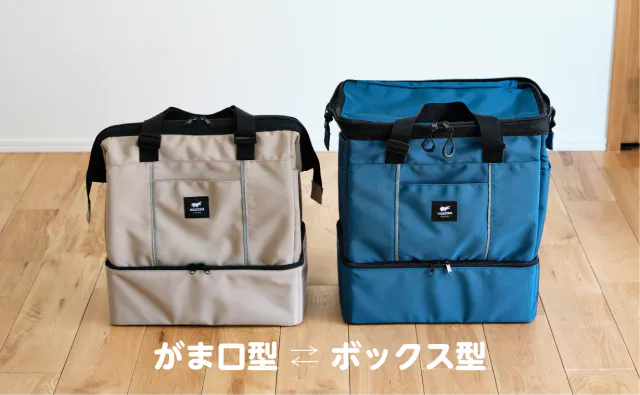 荷物が少ないときの「がま口型」から、荷物が増えたときの「ボックス型」に。両手を空けたいときの「リュック」から、ちょっとそこまで持ち運びたいときの「手提げ」や「肩掛け」に。