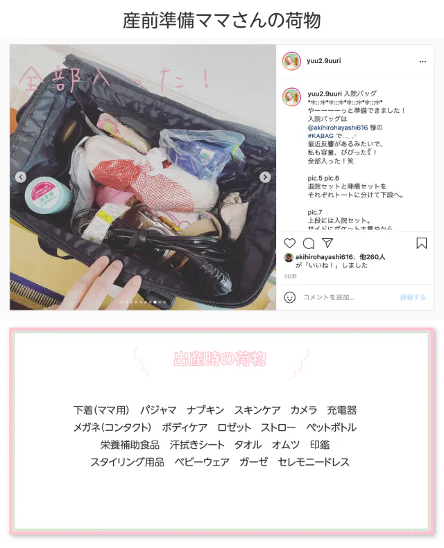 下着(ママ用)、パジャマ、ナプキン、スキンケア、カメラ、充電器、メガネ(コンタクト)、ボディケア、ストロー、ペットボトル、栄養補助食品、汗拭きシート、タオル、印鑑、スタイリング用品、