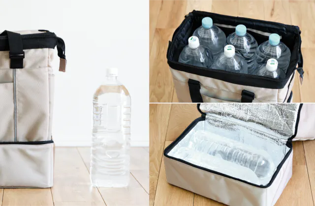 子どもの成長とともに変化する中身を全部入れられる容量にしたのが今回のKABAGマザーズ。上部には2Lペットボトルが6本、下部には2Lペットボトルが2本がすっぽり入る容量です。