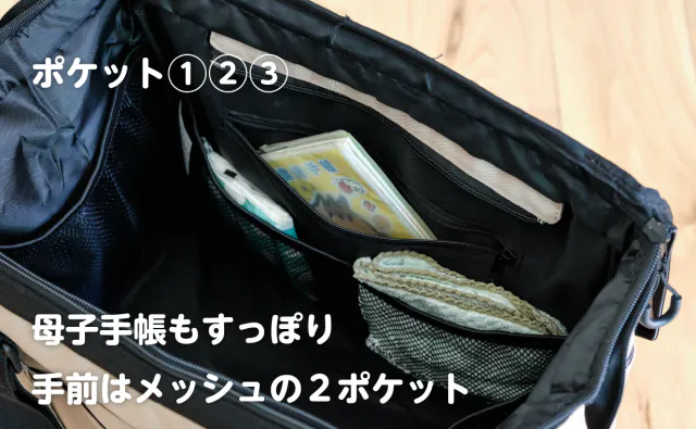 母子手帳もスムーズに出し入れできます。大切なものはチャック付きで中身が見えないこのポケットに、よく使うものは中身が見えて探しやすいメッシュポケットに、使い分けが可能です。