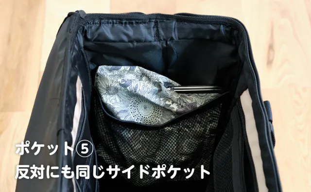 宙に浮かぶメッシュポケットの裏には、左右の大きさが違う2つのポケットがあります。