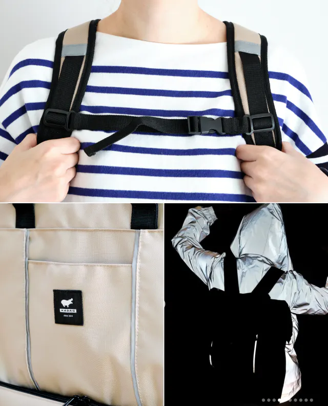 豊富な機能を持ちながら、シンプルな見た目が特徴です。いつでもどこでもご使用いただけるように、光沢感のある生地を使用し、表面とショルダー部分にリフレクターを付けています。