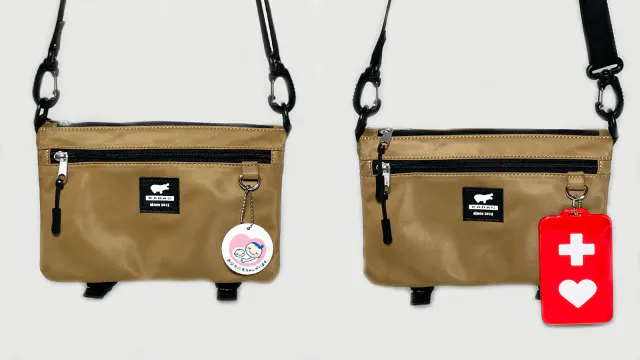 周りの人の目にとまりやすいように、ヘルプマークやマタニティーマークをつけることができる金具を本体の正面につけました。