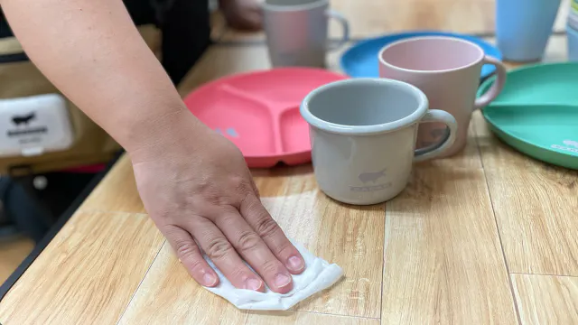 シートの後ろに吊り下げると子供たちでも簡単にサッと出せてパッと拭けます。