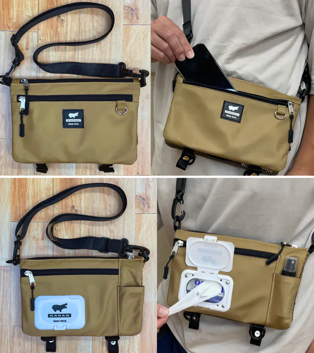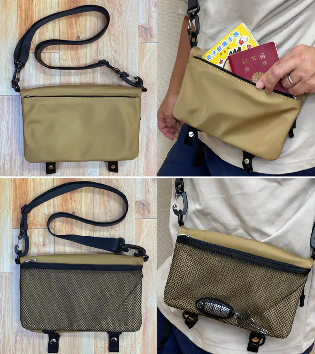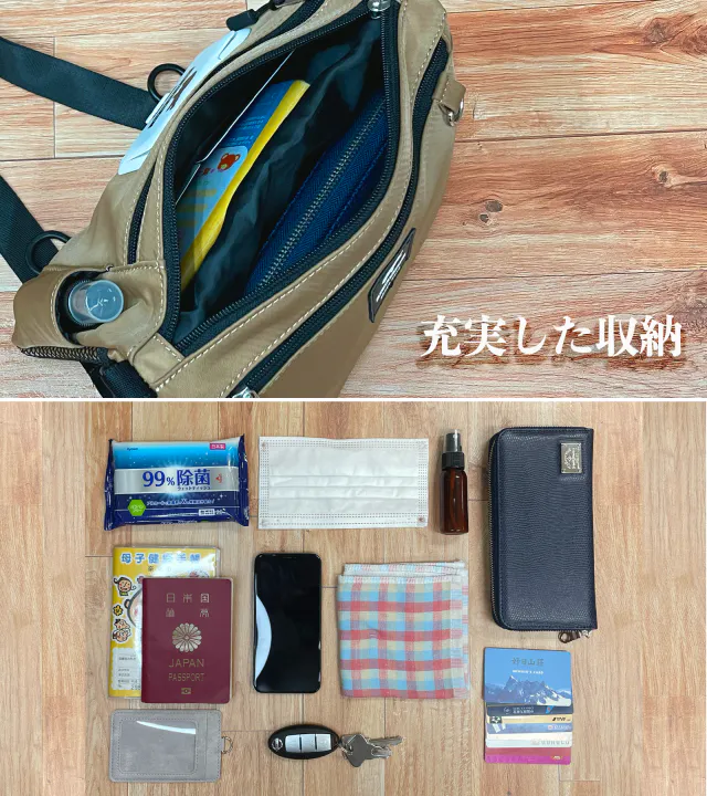 定番の財布、スマホ、カギ等、ひととおりのモノが入れる収納力。そして、新定番の除菌アイテムも入る実用性がKABAG with の持ち味です。