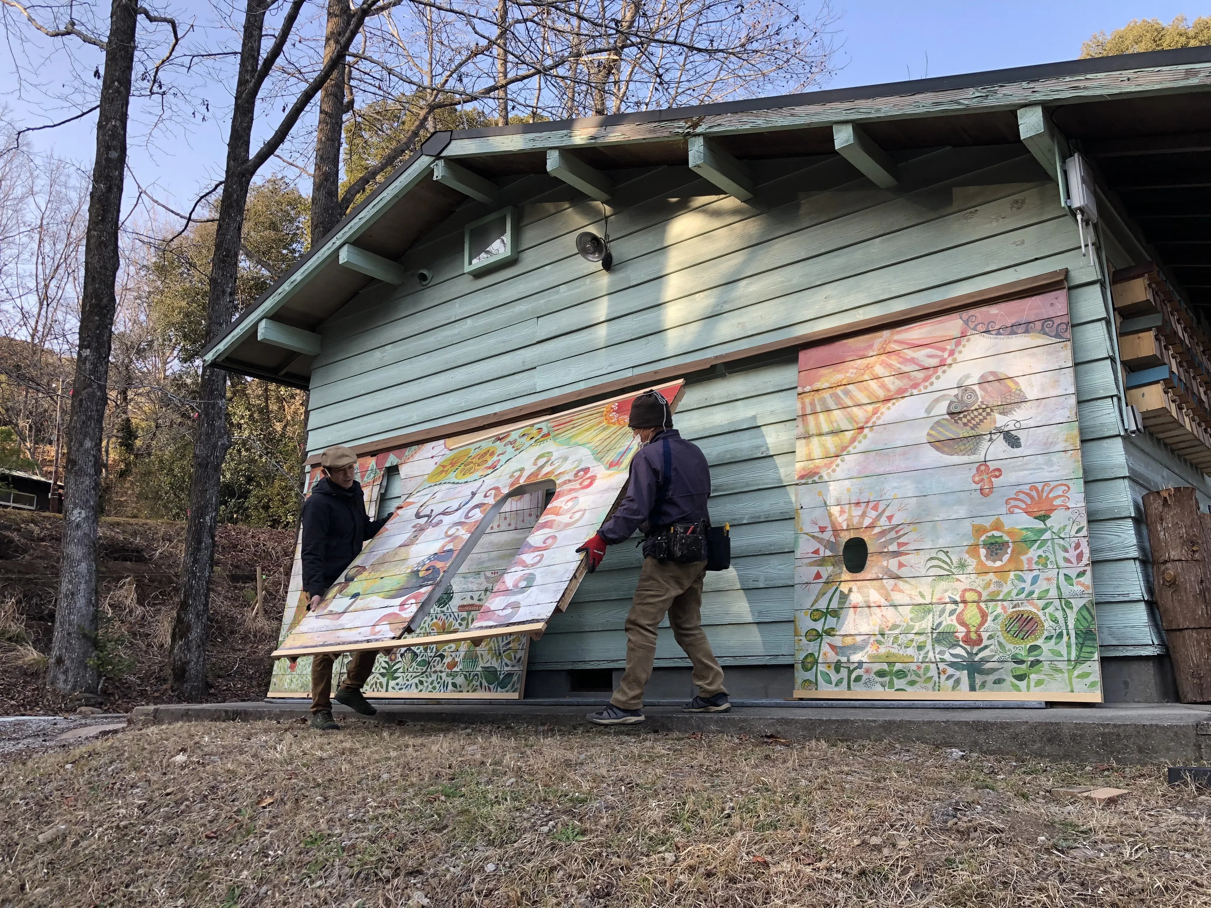 ただいま、撤去したツリーハウスの壁画の修復作業中!