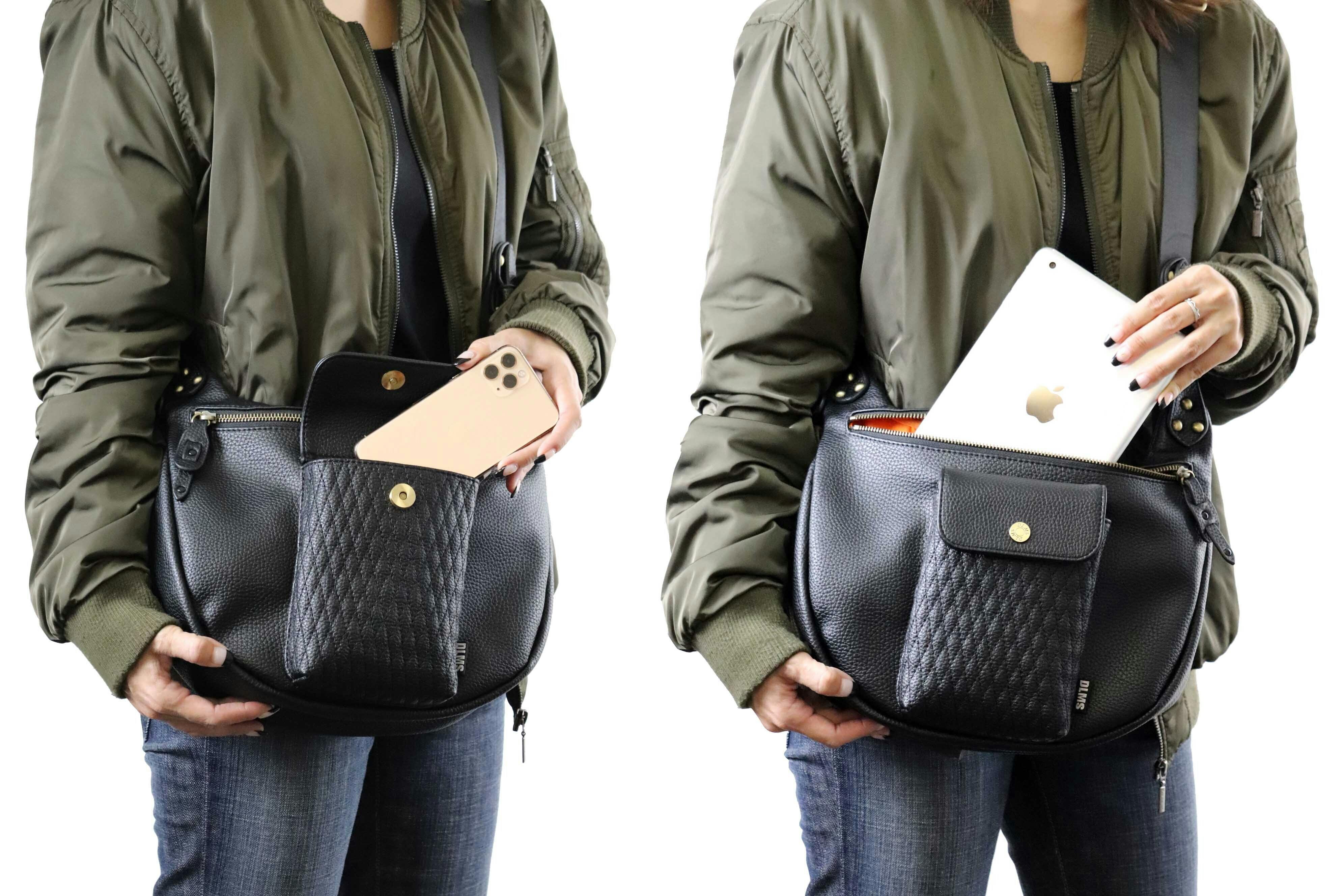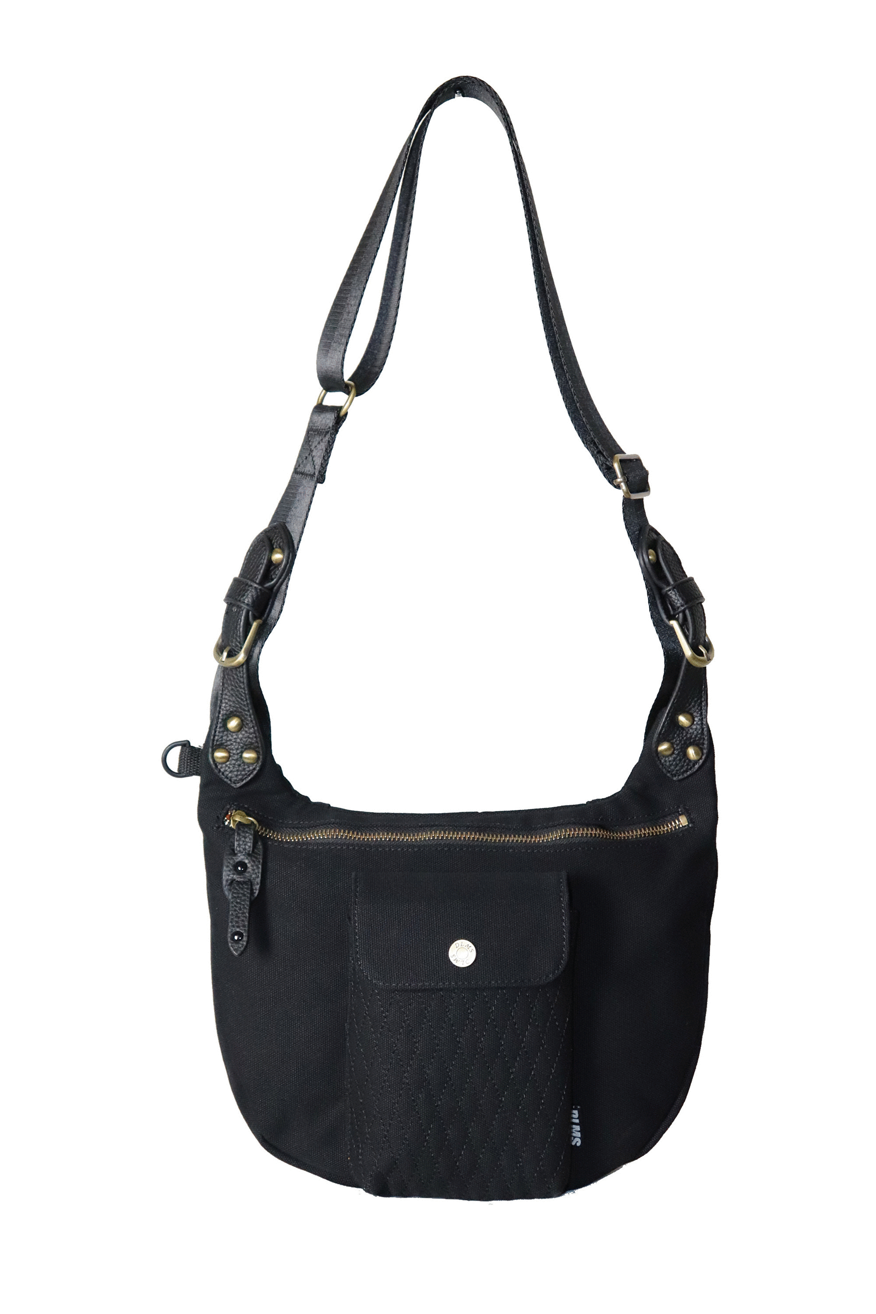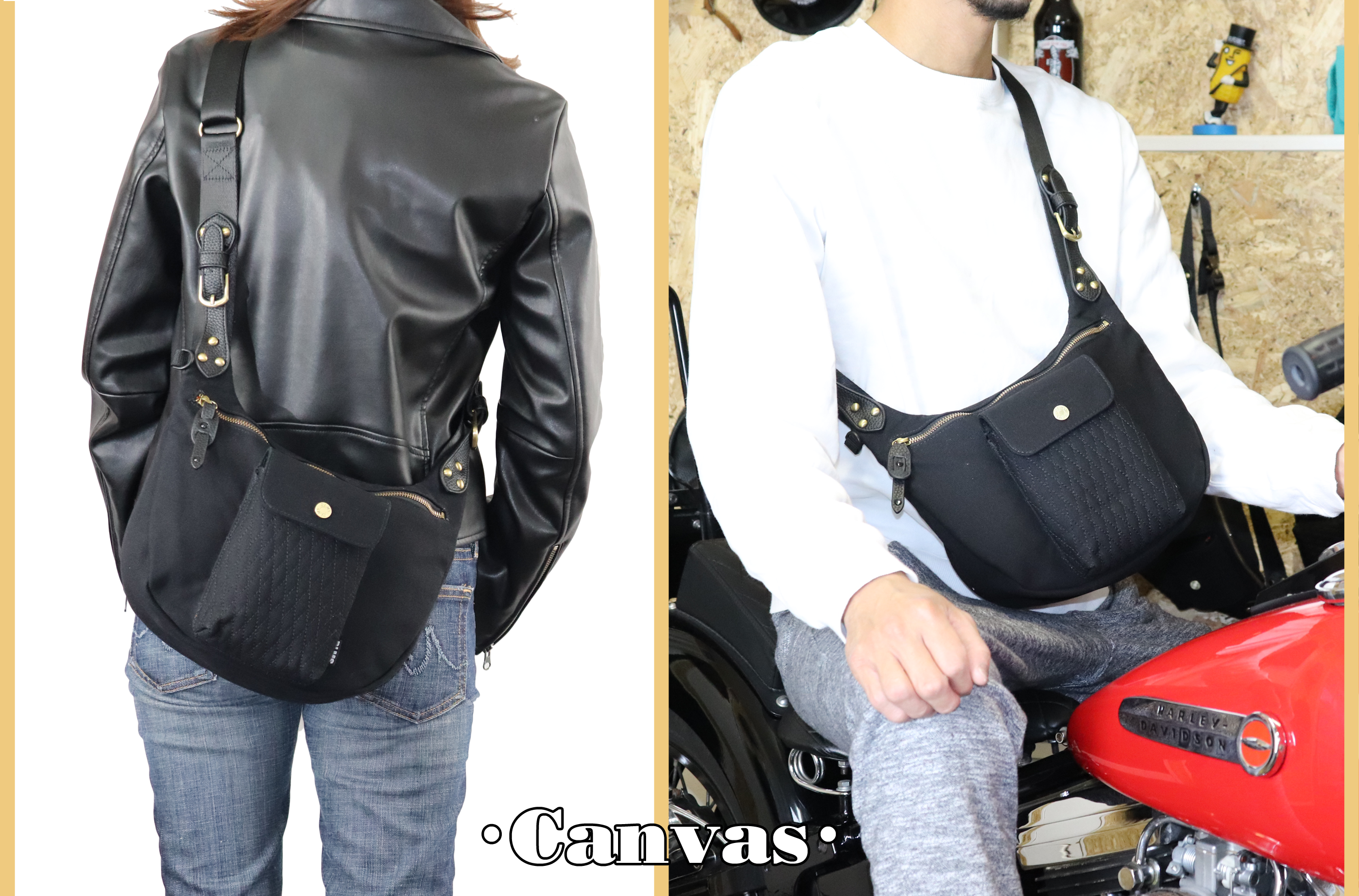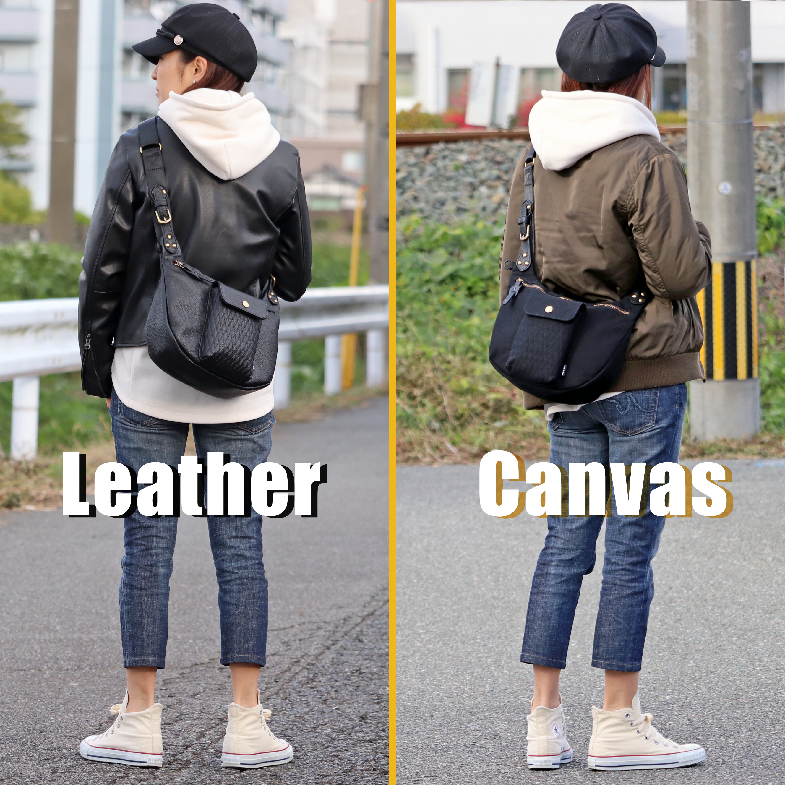 ・キャンバスは帆布の綿生地のです。レザーに比べると本体の黒の表情は落ち着いた色合いです。ソフトな手触りで張りの有る質感なので汚れにも強く非常に使いやすいです。キャンバスはカジュアルな着こなしやその時折りのコーデに合わせやすいのでお洒落感◎です。Tシャツやコート、ジャンバーにもばっちり似合うショルダーバッグです。