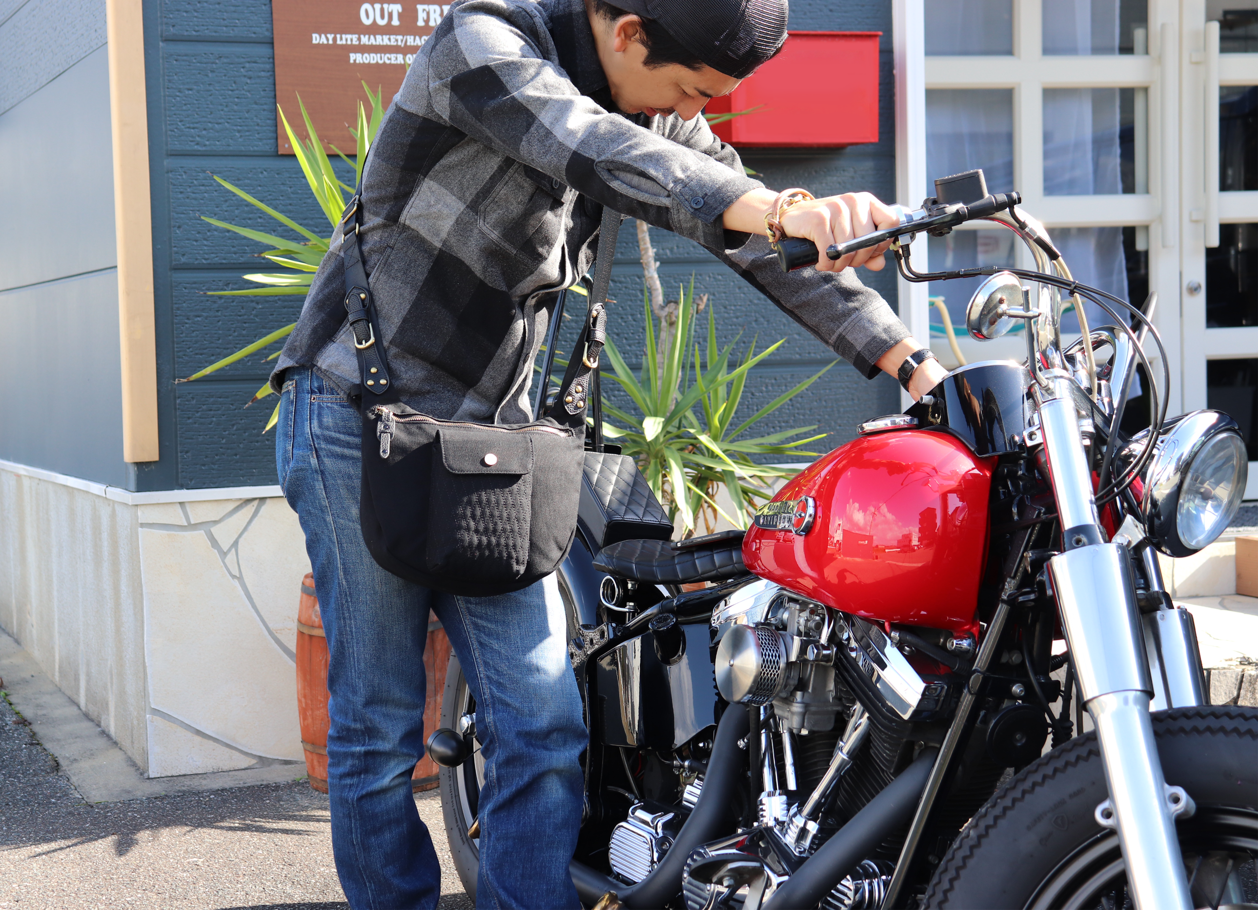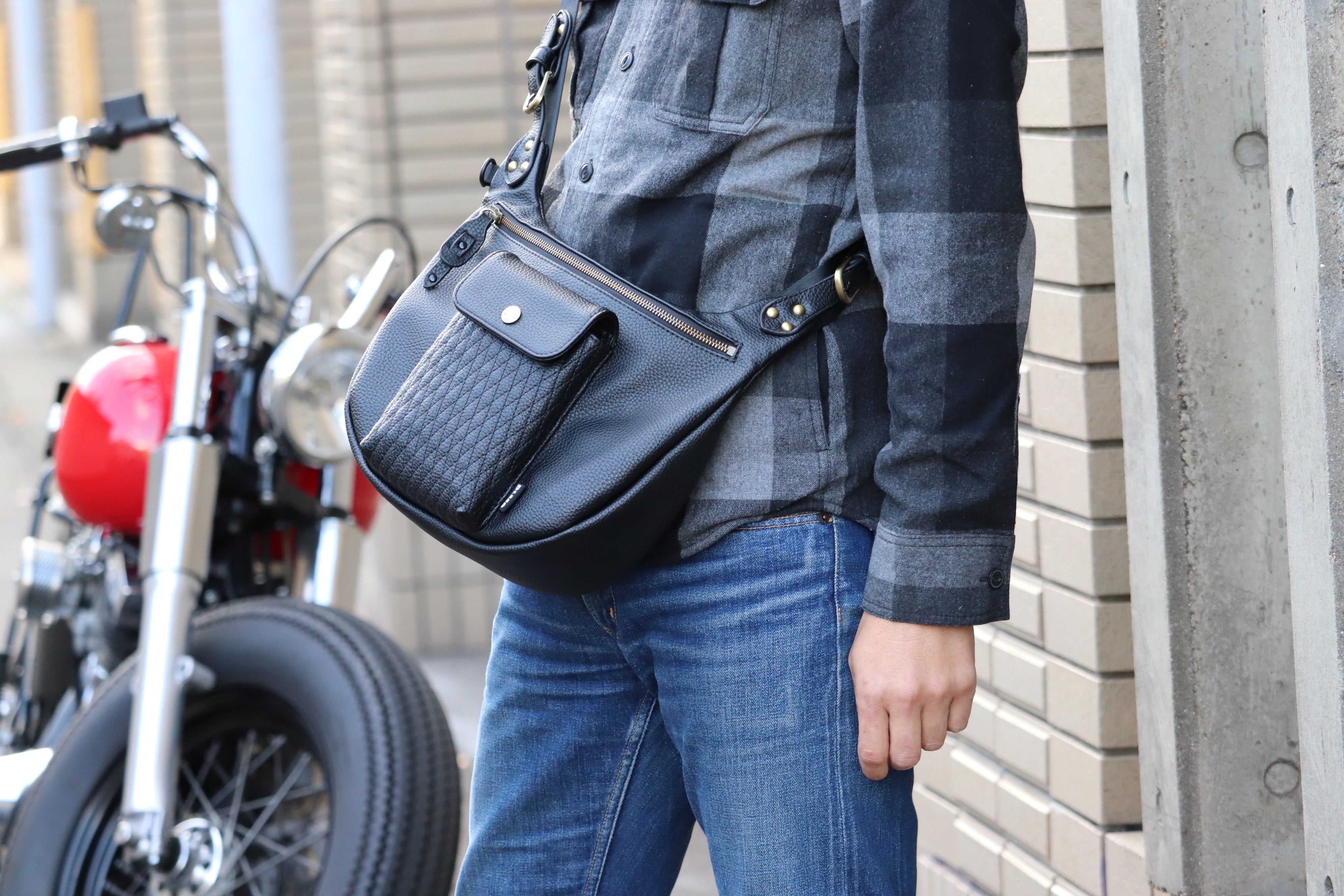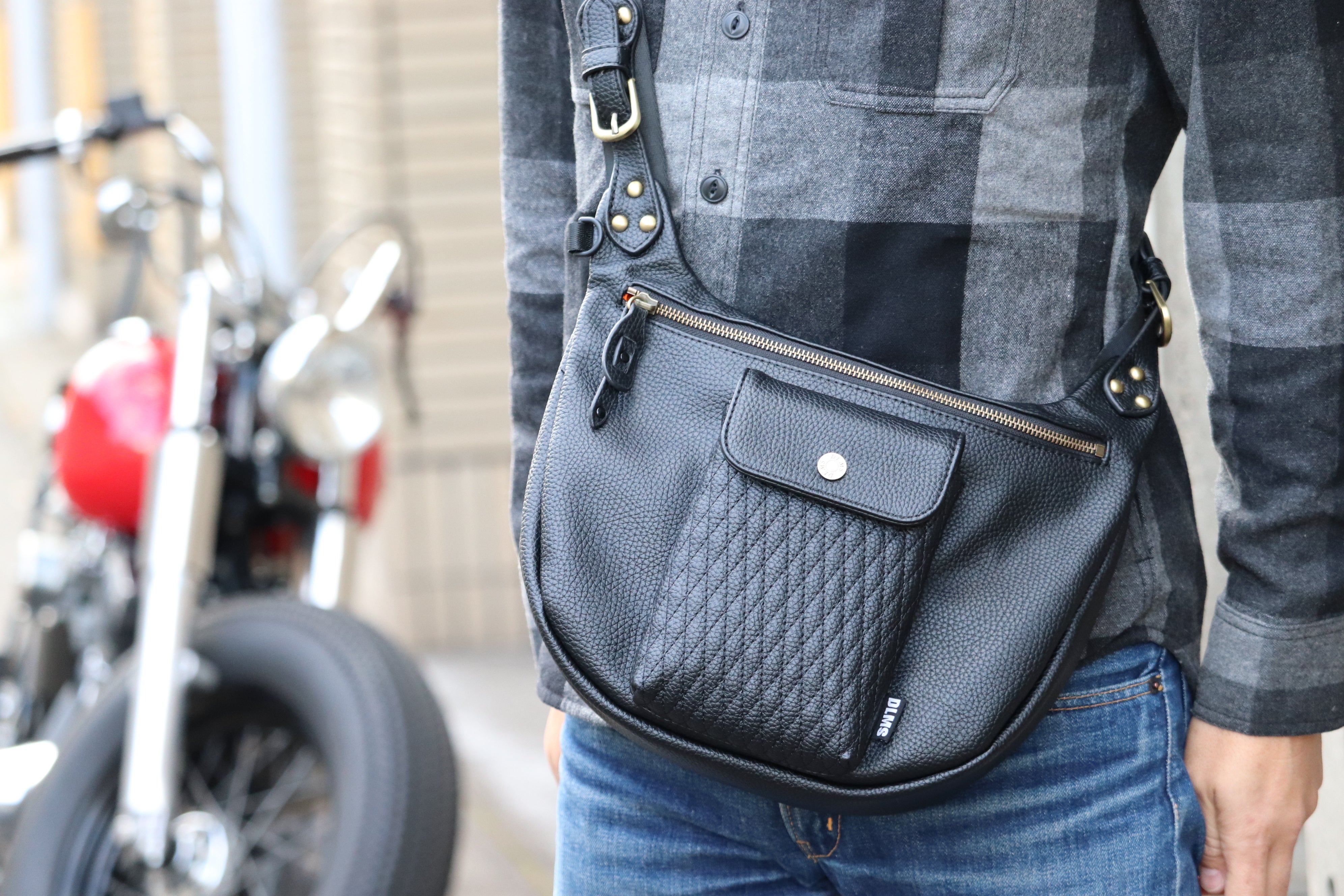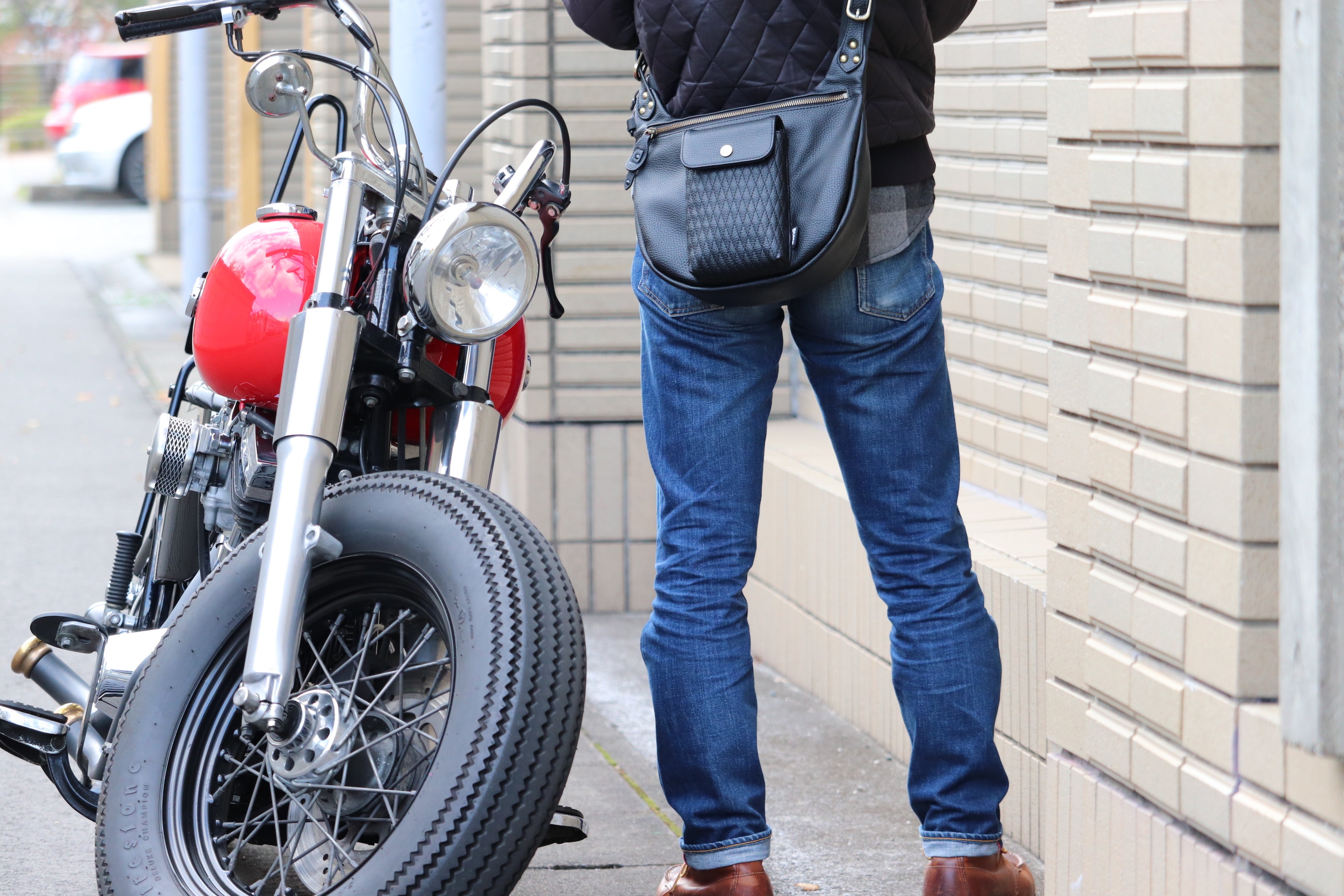 ・レザーの見た目はシボが入った黒々としたもので本革のような質感です。ハードなデザインイメージでバイカーや、牛革を好む方に◎です。本革と違い、雨や水を弾きますのでツーリングなどに使いやすいショルダーバッグです。
