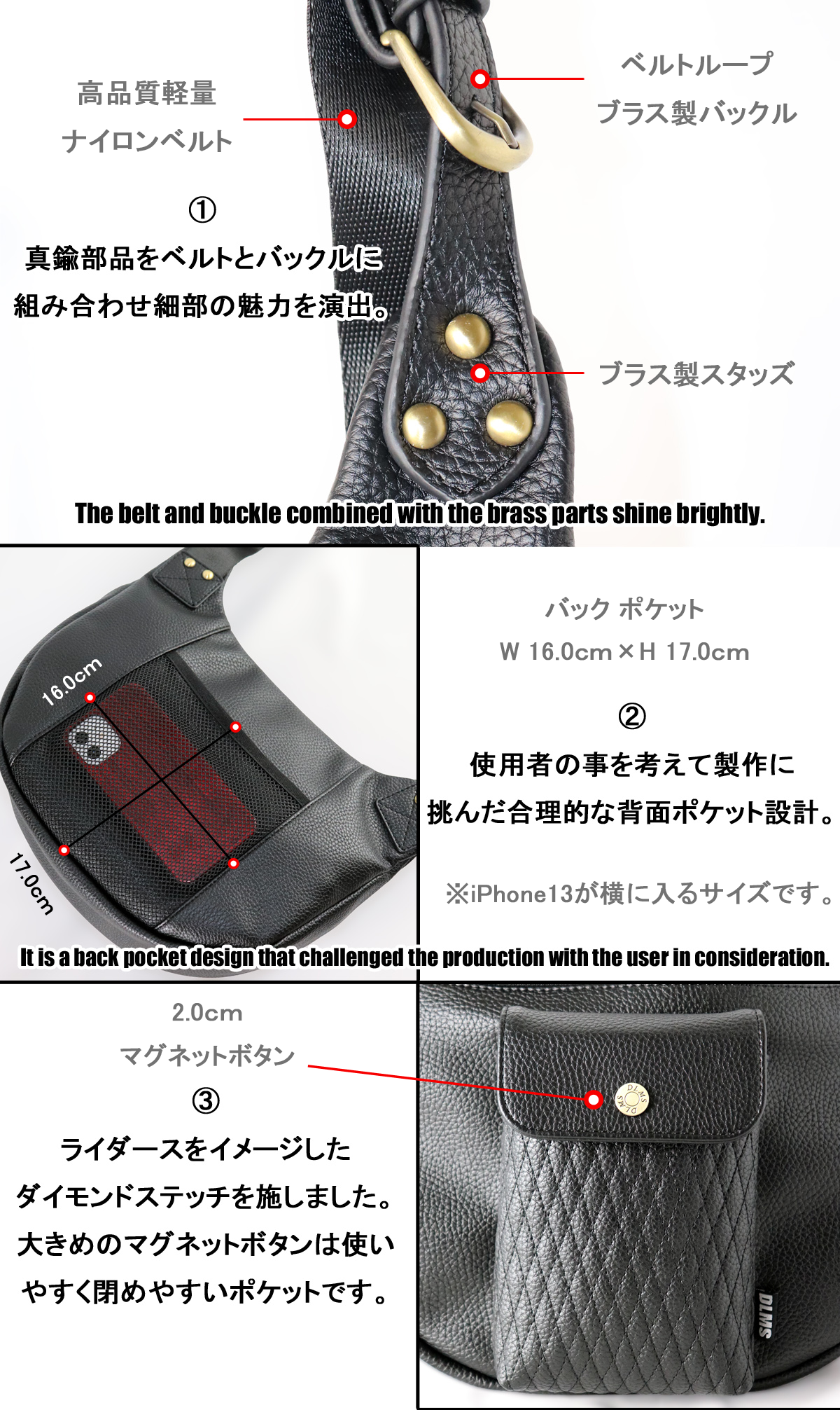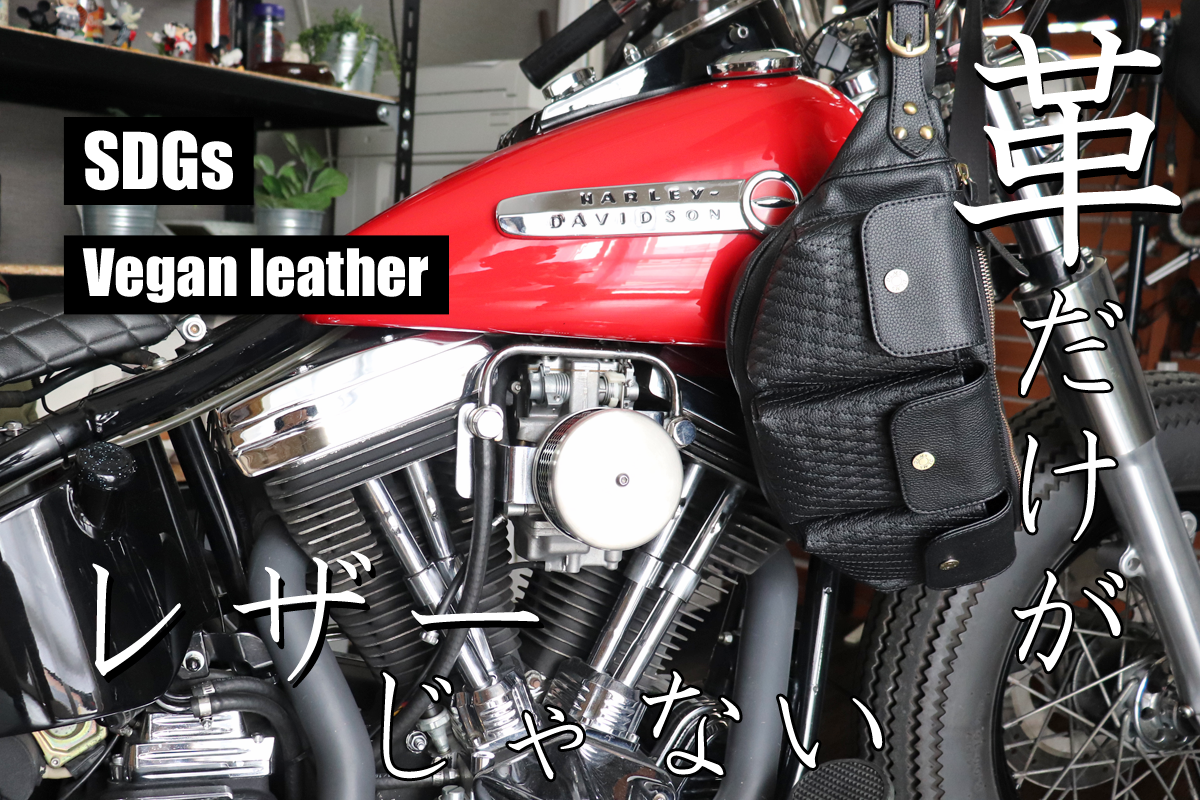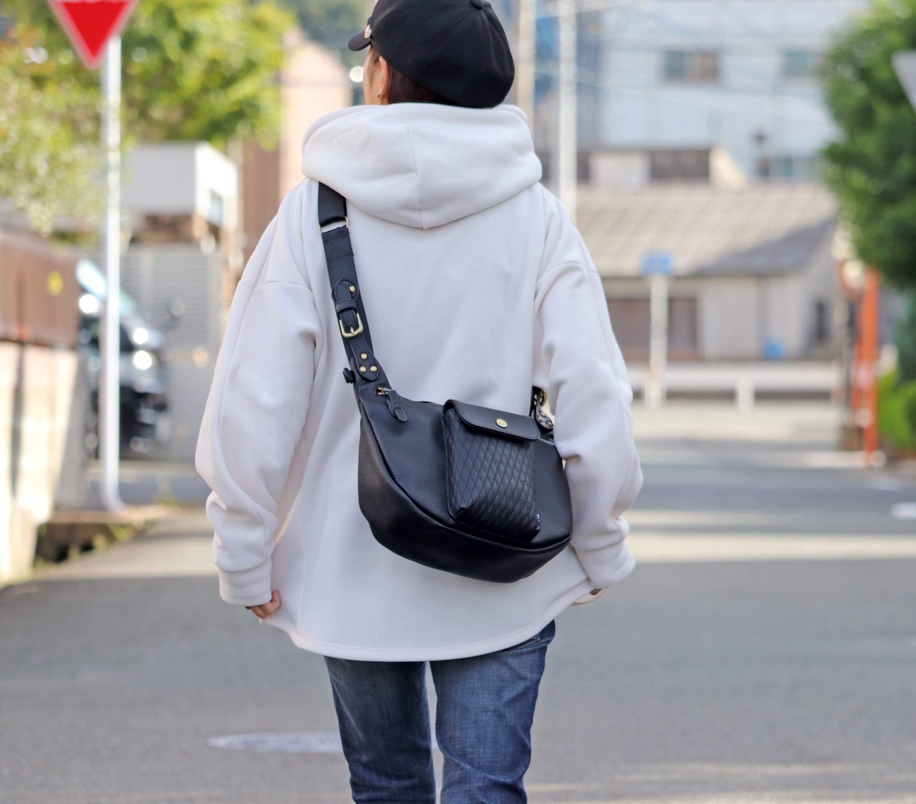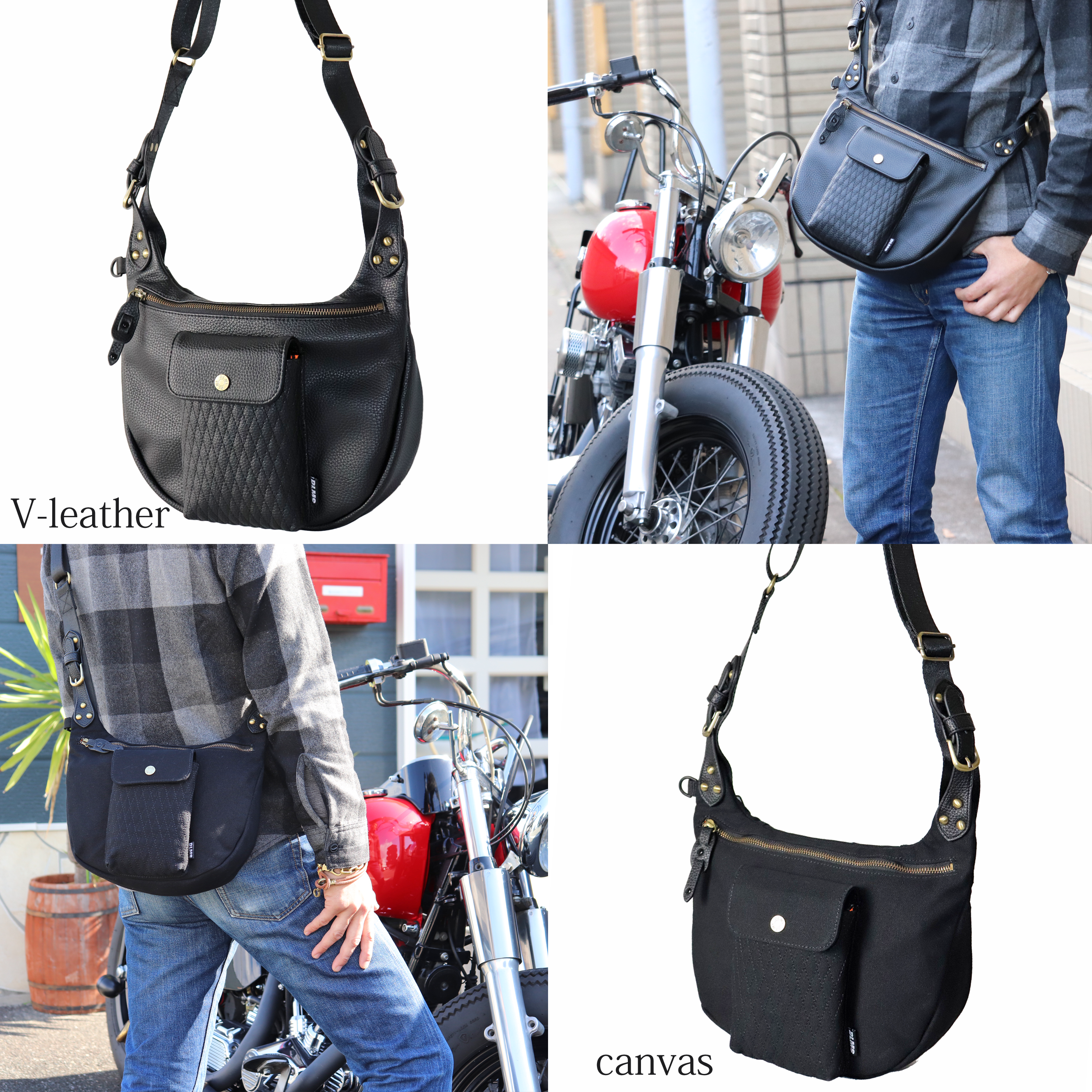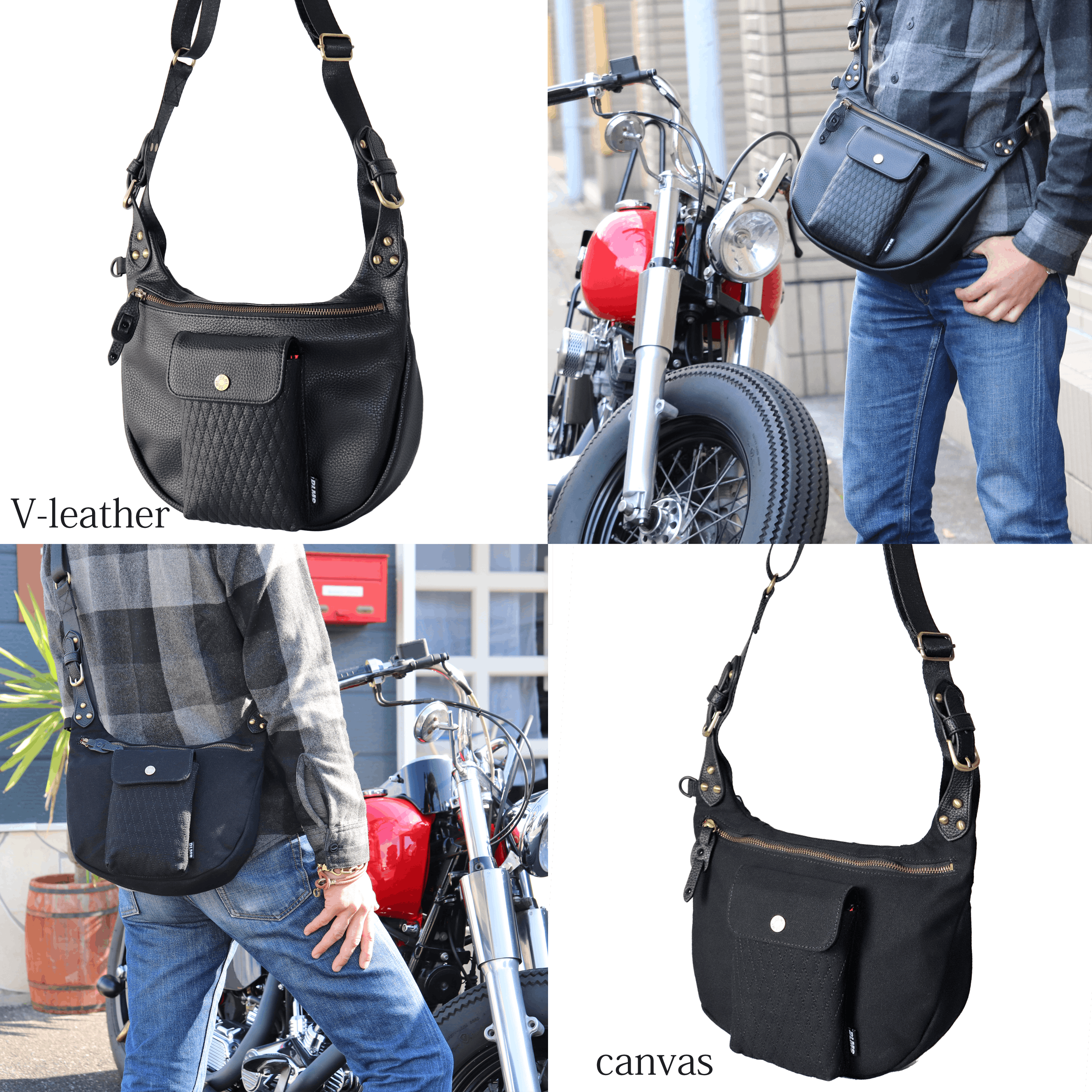 ・レザーの見た目はシボが入った黒々としたもので本革のような質感です。ハードなデザインイメージでバイカーや、牛革を好む方に◎です。本革と違い、雨や水を弾きますのでツーリングなどに使いやすいショルダーバッグです。
