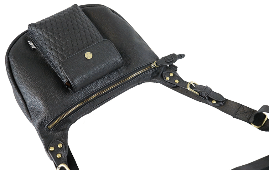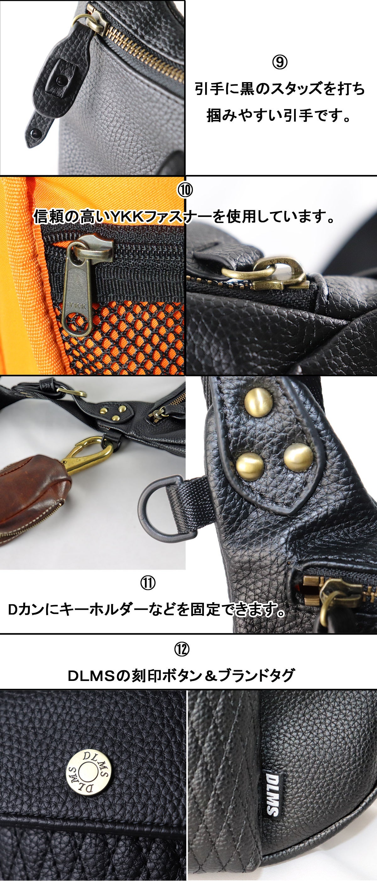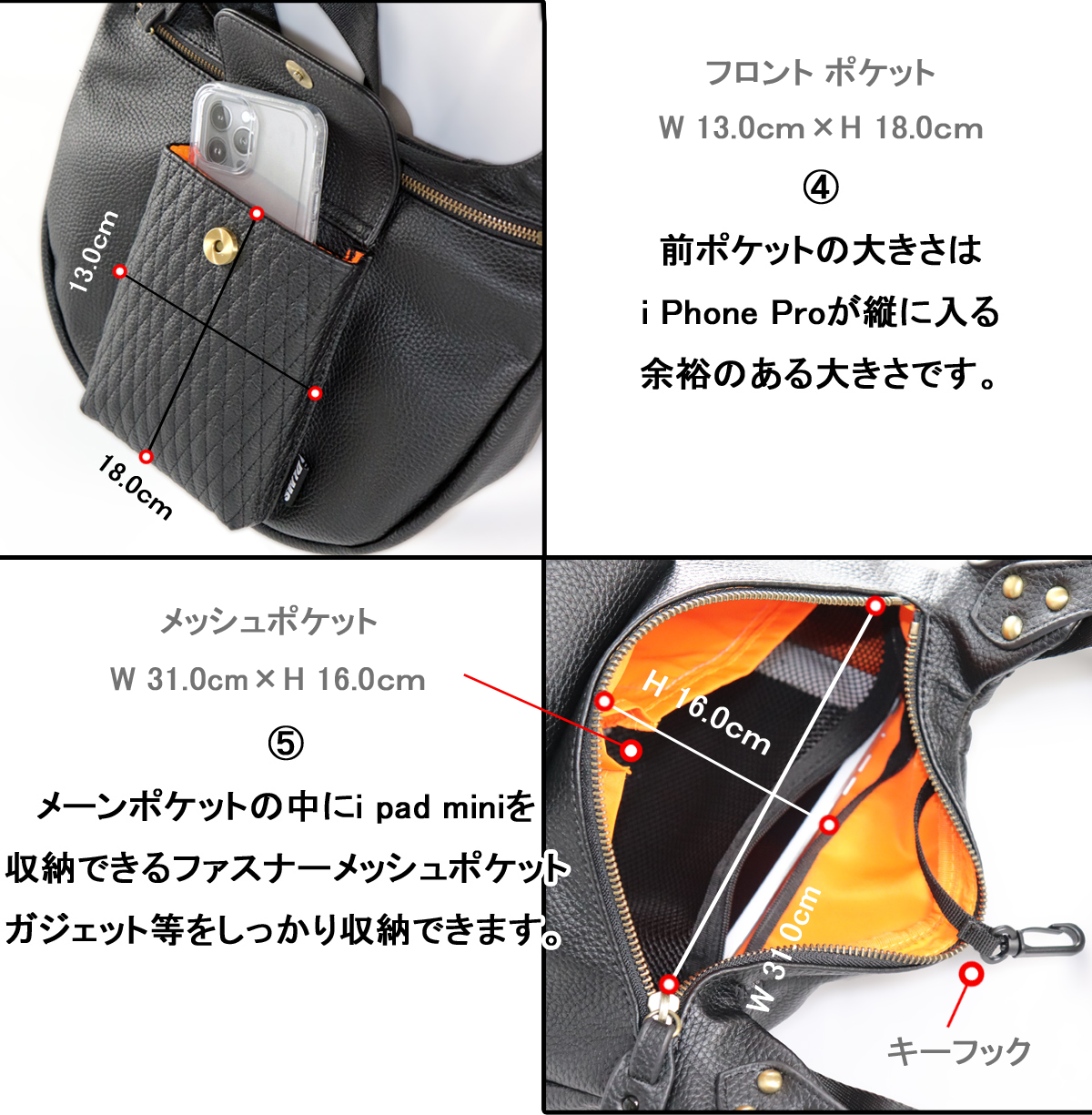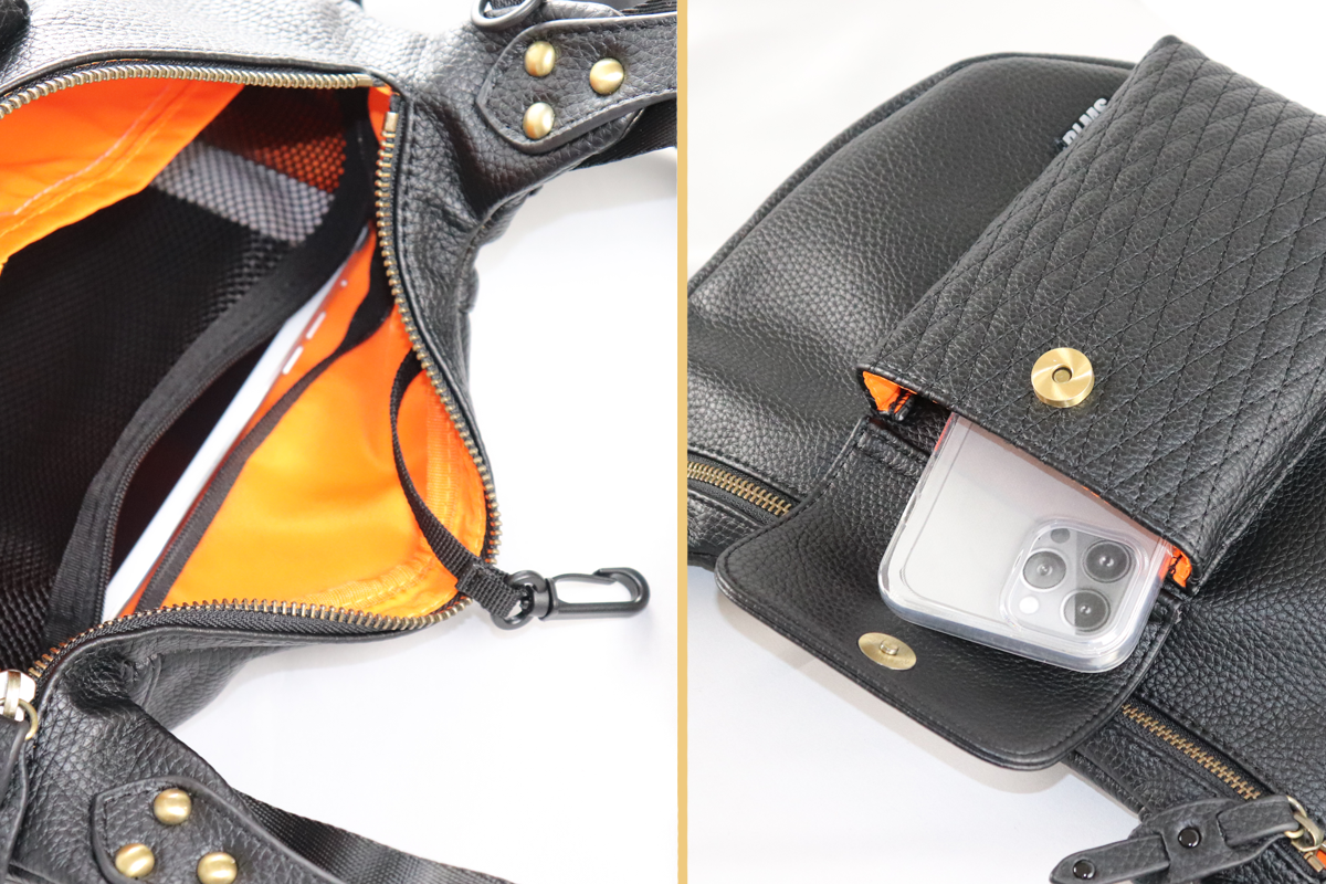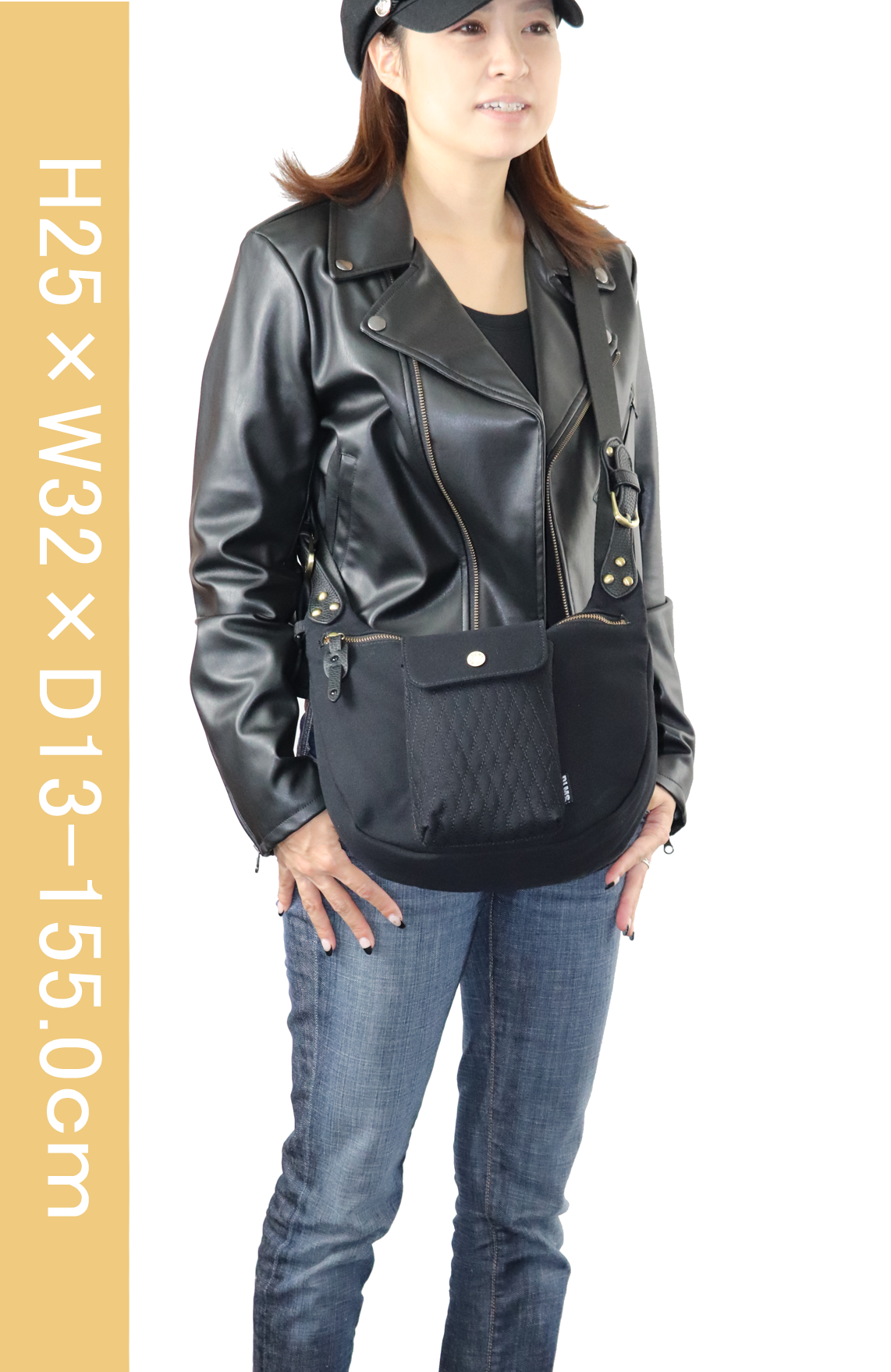 ・レザーの見た目はシボが入った黒々としたもので本革のような質感です。ハードなデザインイメージでバイカーや、牛革を好む方に◎です。本革と違い、雨や水を弾きますのでツーリングなどに使いやすいショルダーバッグです。