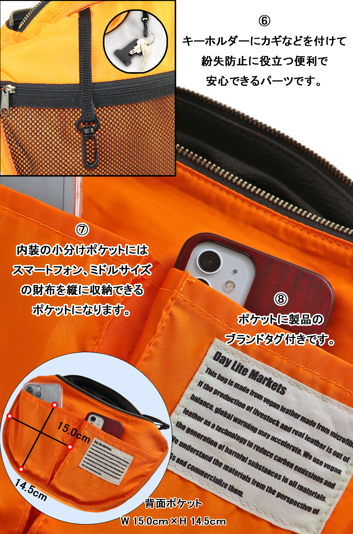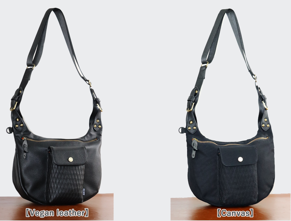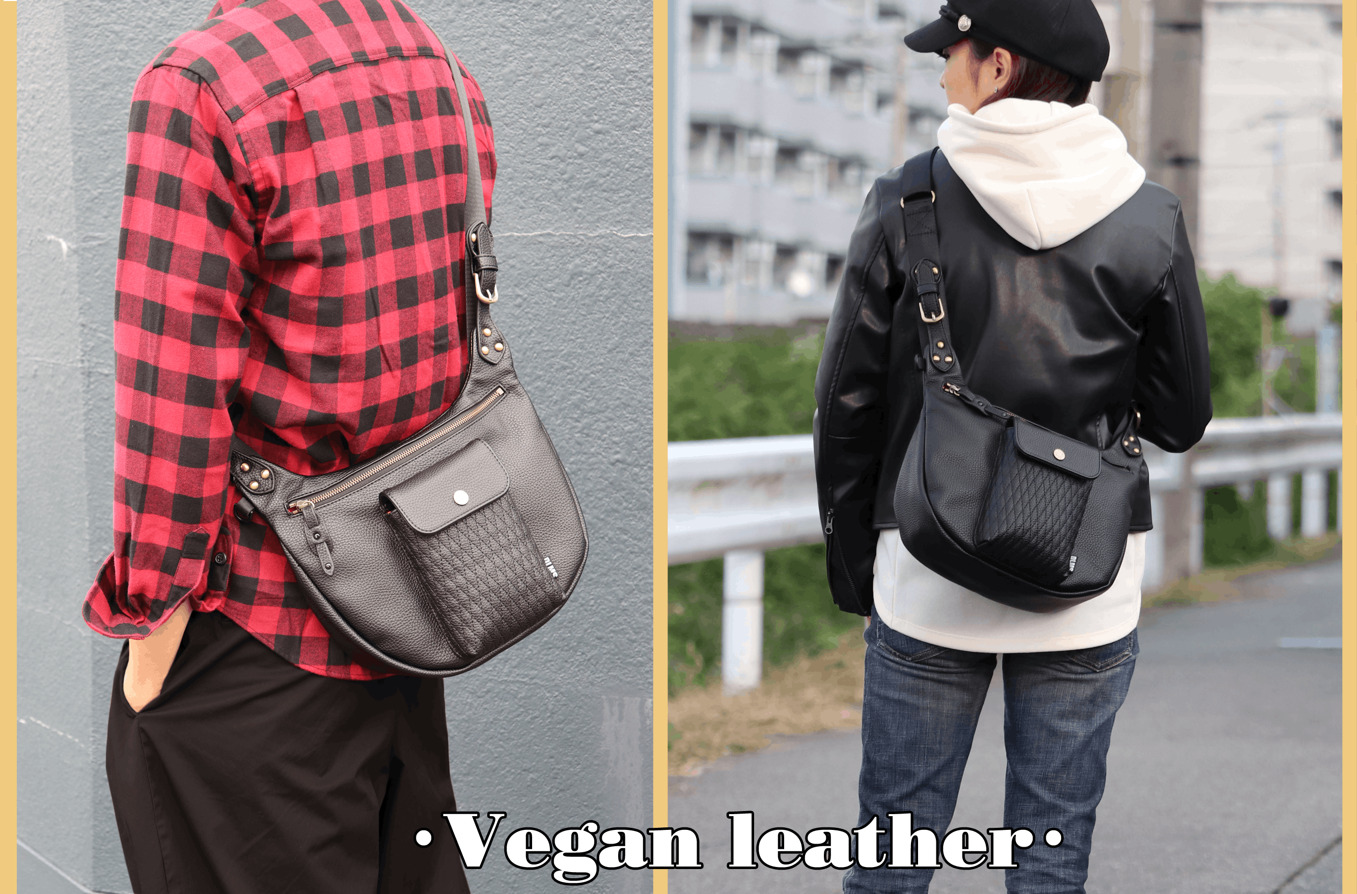 ・バッグの素材はヴィーガンレザー(マイクロファイバー革)とキャンバス(帆布)の2タイプのショルダーバッグ。マイクロファイバーを使用した生地は動物性の革を使用しておりません。そのため革をなめすときの化学薬品を使用していないことで生産性が良く、硬性強く、重量が軽く、雨水を弾く素材であり持続可能な開発であります。SDGsに取り組んだ環境の良い素材を使用しました。