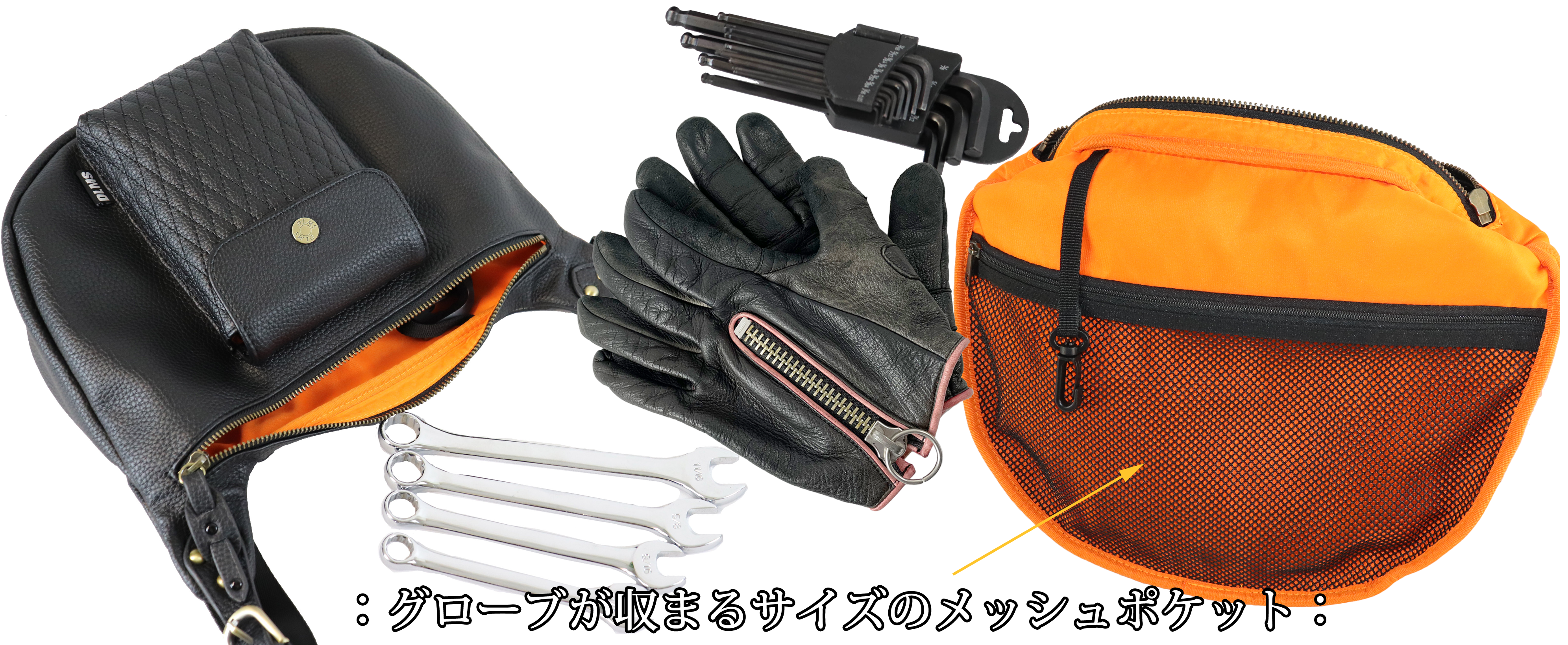 ・必要最小限の工具やグローブなどを小分けする事ができるファスナーメッシュポケットです。